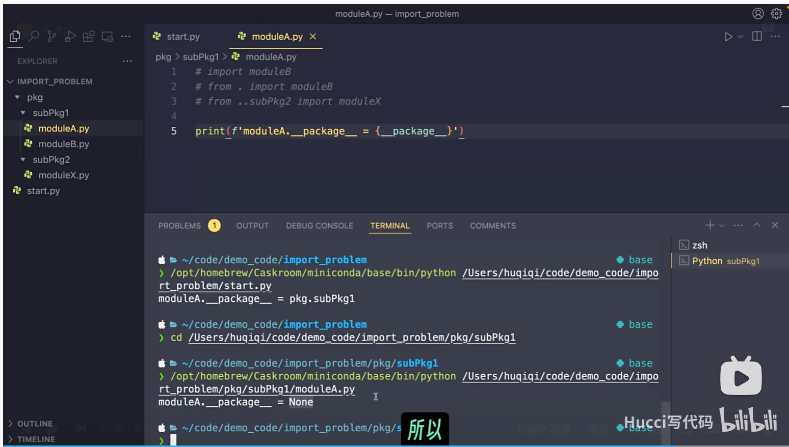 对于下面的这个例子,如果从start.py作为程序的入口,那么moduleA的__package__说就是省略/pkg/subPkg1。如果以moduleA.py为程序的入口,那么moduleA的__package__就是None。