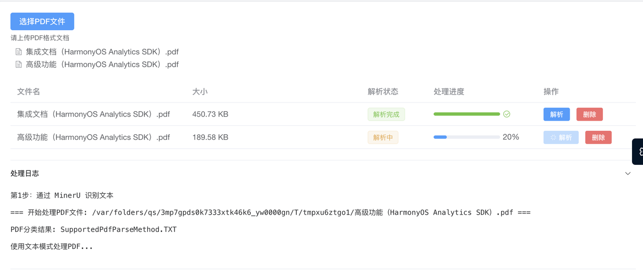 后台管理系统新上传了文档接口,可以实时显示文档解析的进度。需要注意的是目前文档解析并未存储到文件系统里,上传功能并未做持久化。