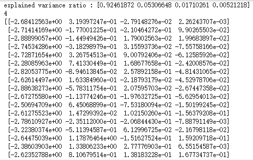 # -*- coding: utf-8 -*- import numpy as np import matplotlib.pyplot as plt from sklearn import datasets,decomposition def load_data(): ''' 加载用于降维的数据 ''' # 使用 scikit-learn 自带的 iris 数据集 iris=datasets.load_iris() return iris.data,iris.target #超大规模数据集降维IncrementalPCA模型 def test_IncrementalPCA(*data): X,y=data # 使用默认的 n_components pca=decomposition.IncrementalPCA(n_components=None,batch_size=10) pca.partial_fit(X) aa = pca.transform(X) print('explained variance ratio : %s'% str(pca.explained_variance_ratio_)) print(pca.n_components_) print(aa) # 产生用于降维的数据集 X,y=load_data() # 调用 test_IncrementalPCA test_IncrementalPCA(X,y)