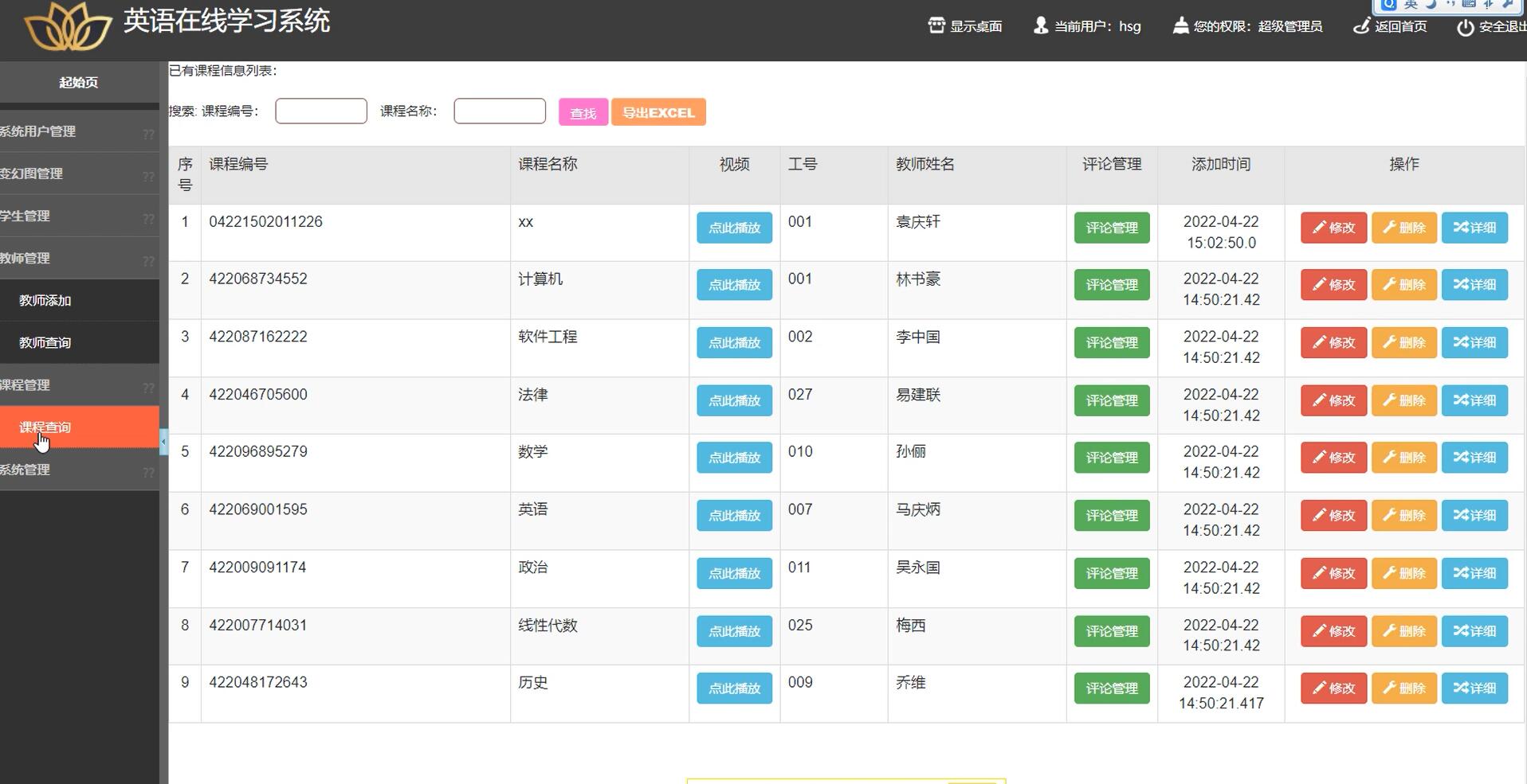 教师管理:管理员可以对教师信息进行管理,包括添加、编辑、删除教师信息等操作。