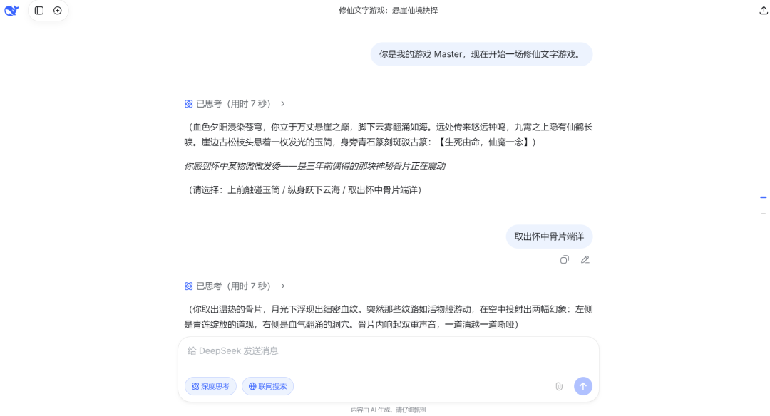 我也没忍住,趁着主编不在,打开 DeepSeek 输入了这么一段话:「你是我的游戏 Master,现在开始一场修仙文字游戏。」