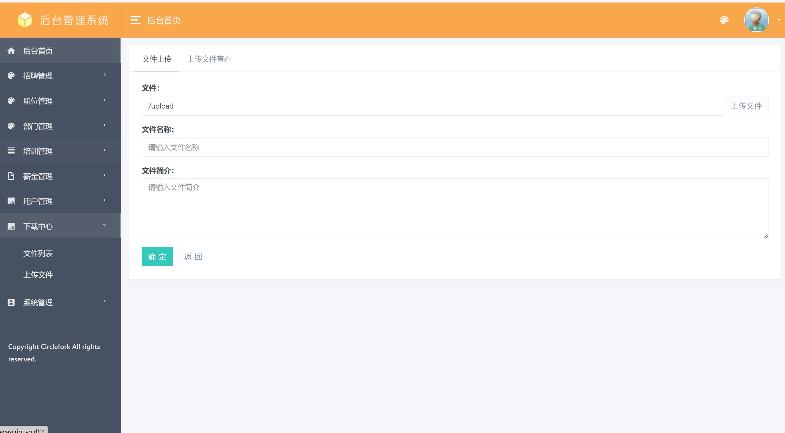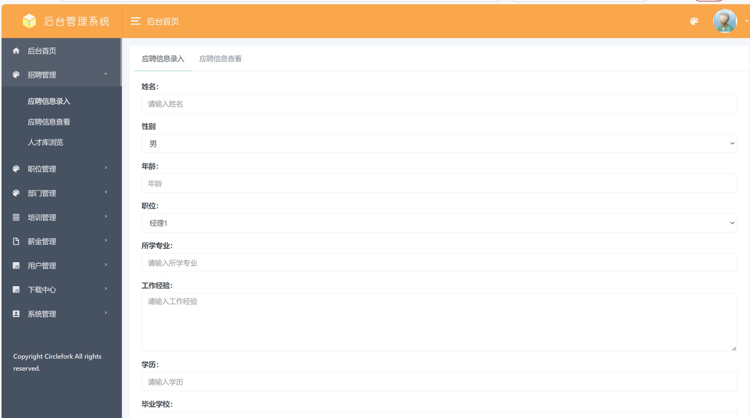 员工;员工使用本系统涉到的功能主要有:首页,个人中心,员工考勤管理,请假申请管理,加班申请管理,员工工资管理,招聘计划管理,员工培训管理,部门培训管理,员工详细管理等功能。