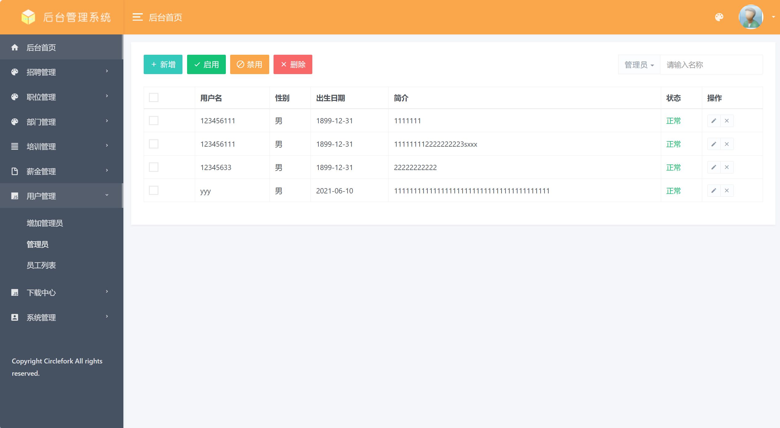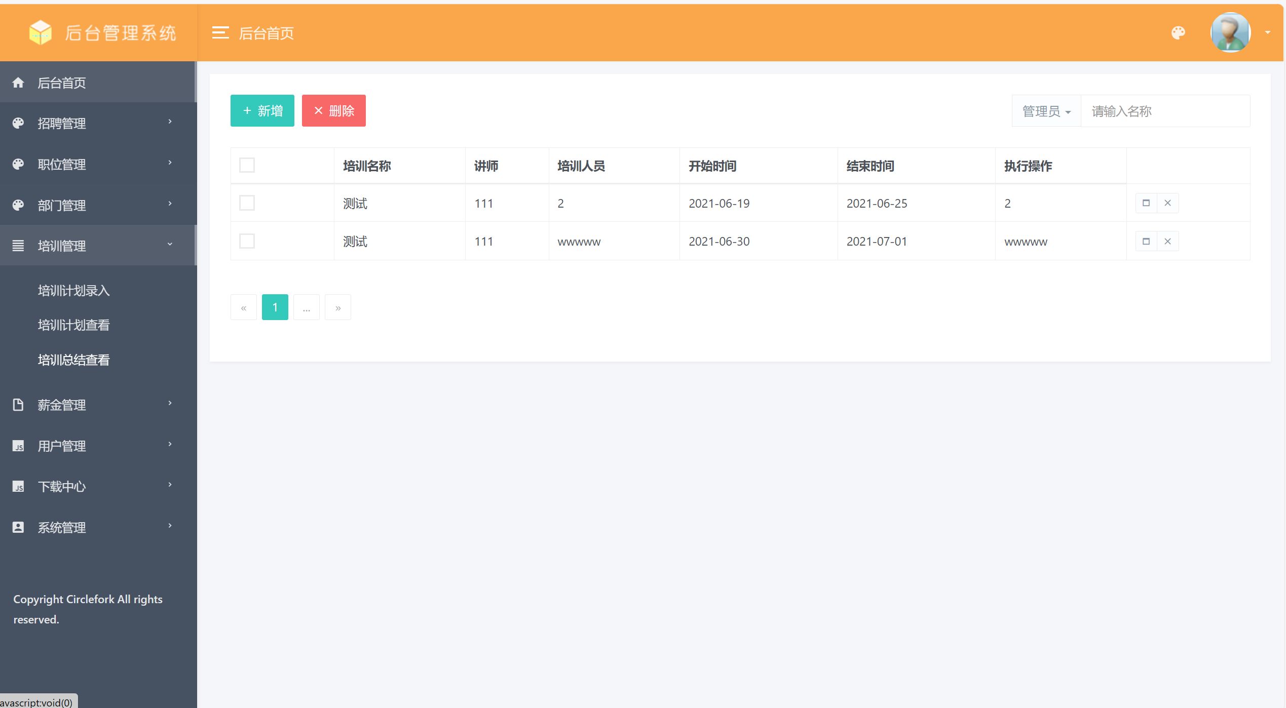 管理员;管理员使用本系统涉到的功能主要有:首页,个人中心,员工管理,部门管理,员工考勤管理,请假申请管理,加班申请管理,员工工资管理,招聘计划管理,员工培训管理,部门培训管理,员工详细管理等功能。