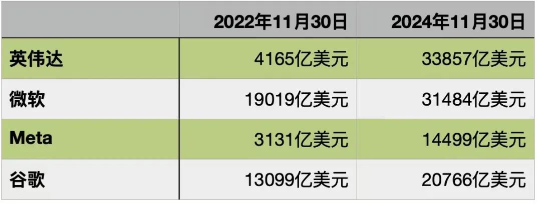 在美国,2024年政府对人工智能的预算创下新高。美国能源部、卫生与公众服务部、交通部、国防部等,累计向AI投入超过2511亿美元。如果叠加资本市场的投入,总投资达数万亿美元。数智前线统计,仅英伟达、微软、谷歌和Meta四家企业,借着AI的东风,在2022年11月~2024年11月期间,市值飙升总计达到6.1万亿美元。全球市值第一大交椅,已由英伟达和苹果轮流坐庄。