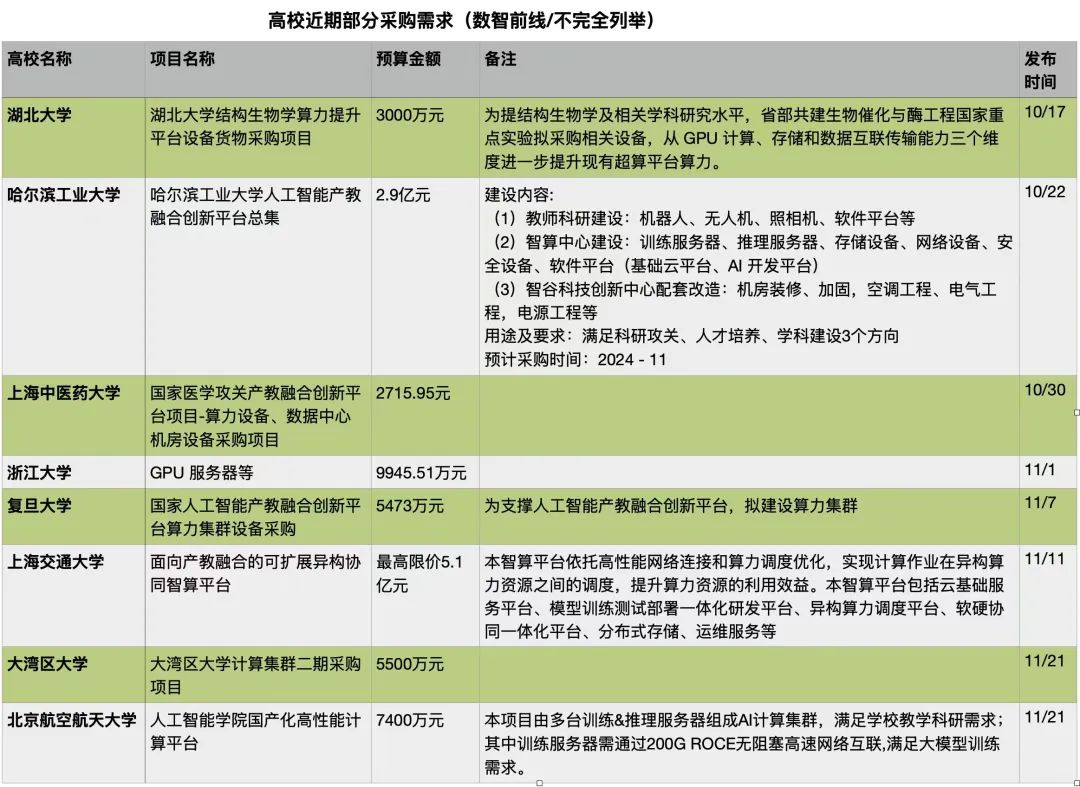 今年诺贝尔奖颁布后,AI for Science大火,高校的智算采购热情也在进一步高涨。近期市场上,多所大学都已发布从数千万元到数亿元的算力采购需求。