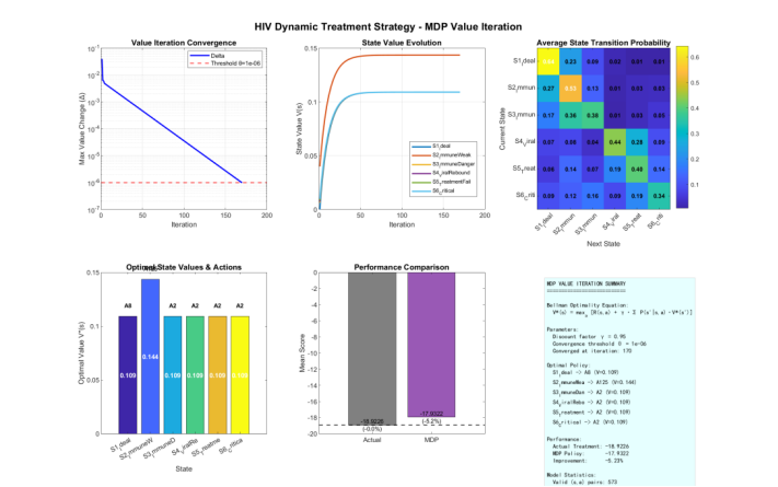 综上所述,本文建立了完整的HIV长期治疗优化框架,主要创新点包括:提出融合病毒学、免疫学与治疗负担的五维综合评价指标体系,实现了多临床目标的量化平衡;将序贯治疗决策问题形式化为MDP并采用DQN求解,突破了传统静态方案的局限性。