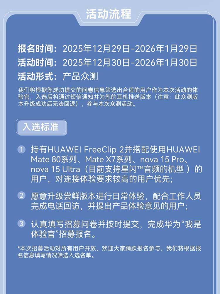 华为FreeClip 2星闪音频众测来啦!12月29日到1月29日报名,Mate 80系列等适配机型用户赶紧冲~