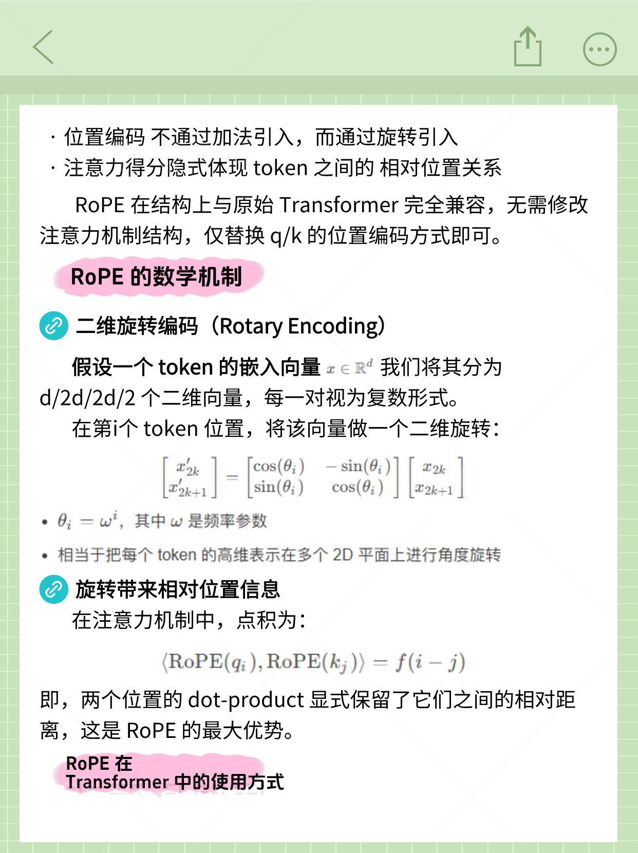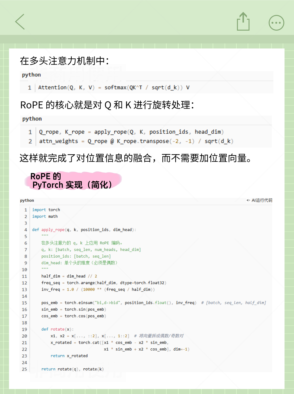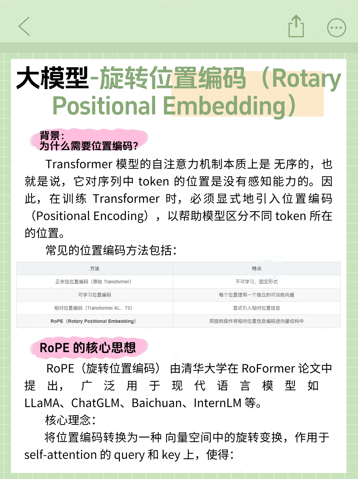 四、RoPE 在 Transformer 中的使用方式。五、RoPE 的 PyTorch 实现(简化)六、RoPE 的直观理解(可视化思想)七、RoPE 与其他位置编码方法对比。一、背景:为什么需要位置编码?二、RoPE 的核心思想。三、RoPE 的数学机制。八、RoPE 的优点总结。九、RoPE 的应用模型。