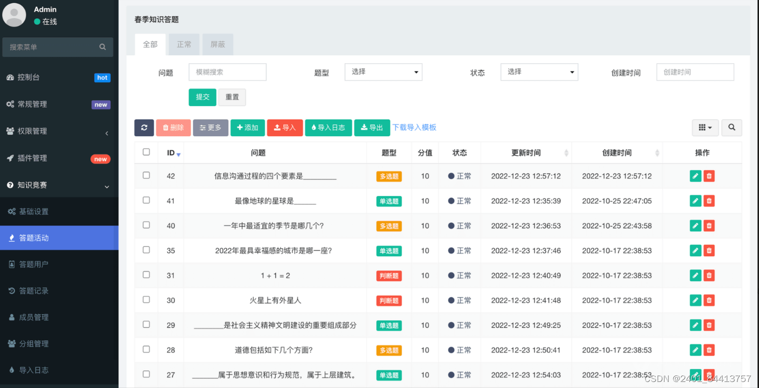 题库管理:系统支持题库的创建、编辑、导入和导出,方便管理员对题目进行统一管理和维护。