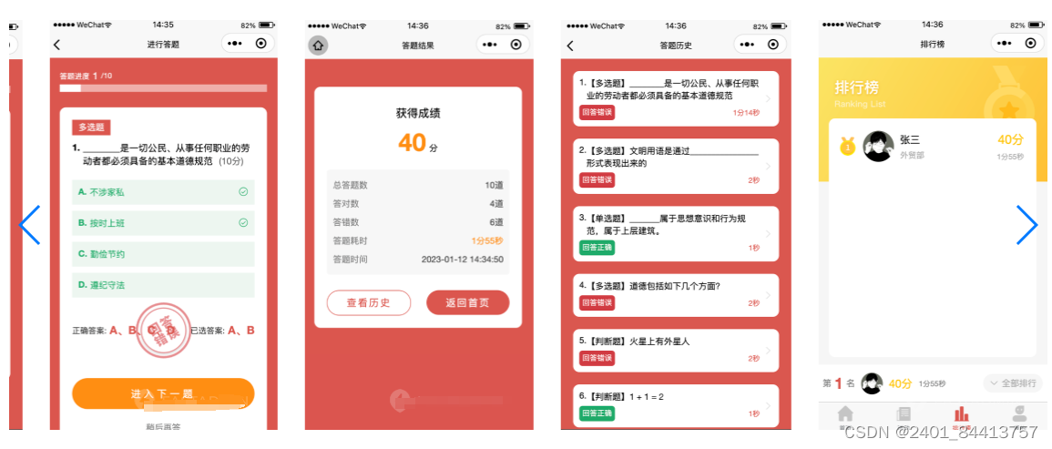 在线答题:用户可以通过系统参与在线答题,系统实时记录用户的答题情况,并提供答案解析和成绩排名。