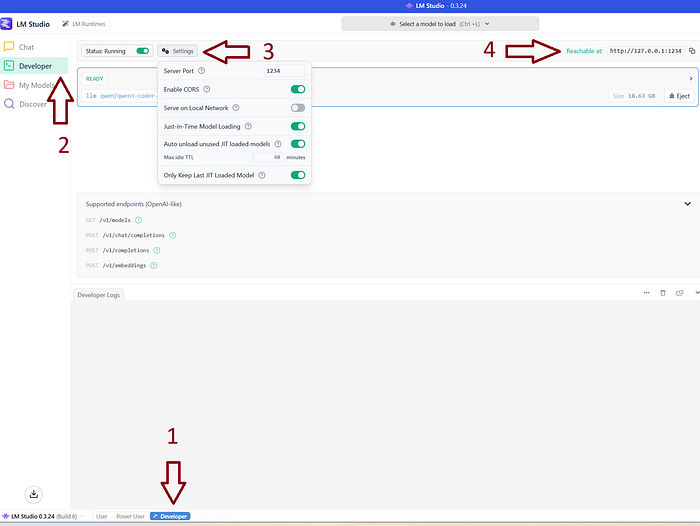 - 进入开发者窗口,并点击“Start Server”,使模型通过本地主机地址(如