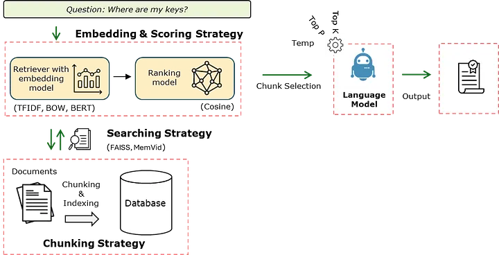 - • 嵌入策略 (Embedding Strategy): 将文本块和查询转换为向量表示。