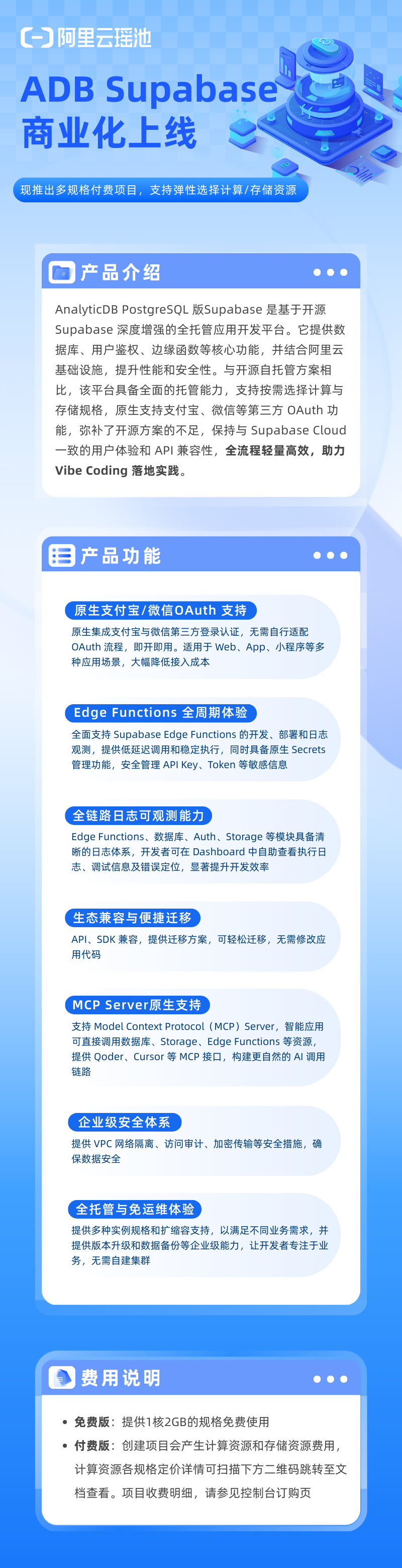 自2025年12月11日起,云原生数据仓库 AnalyticDB PostgreSQL 版 Supabase 正式上线并进入商业化阶段。