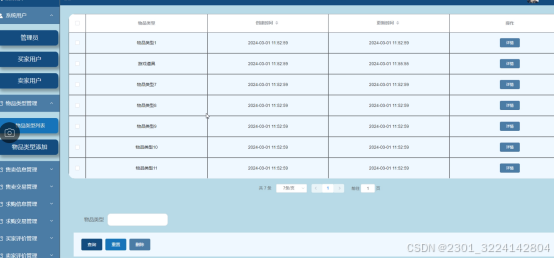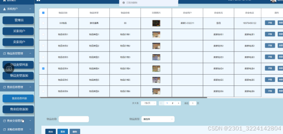 - 售卖信息管理:管理员可查看售卖信息列表,包括物品名称、类型、价格、卖家用户等信息,同时可以添加新的售卖信息。