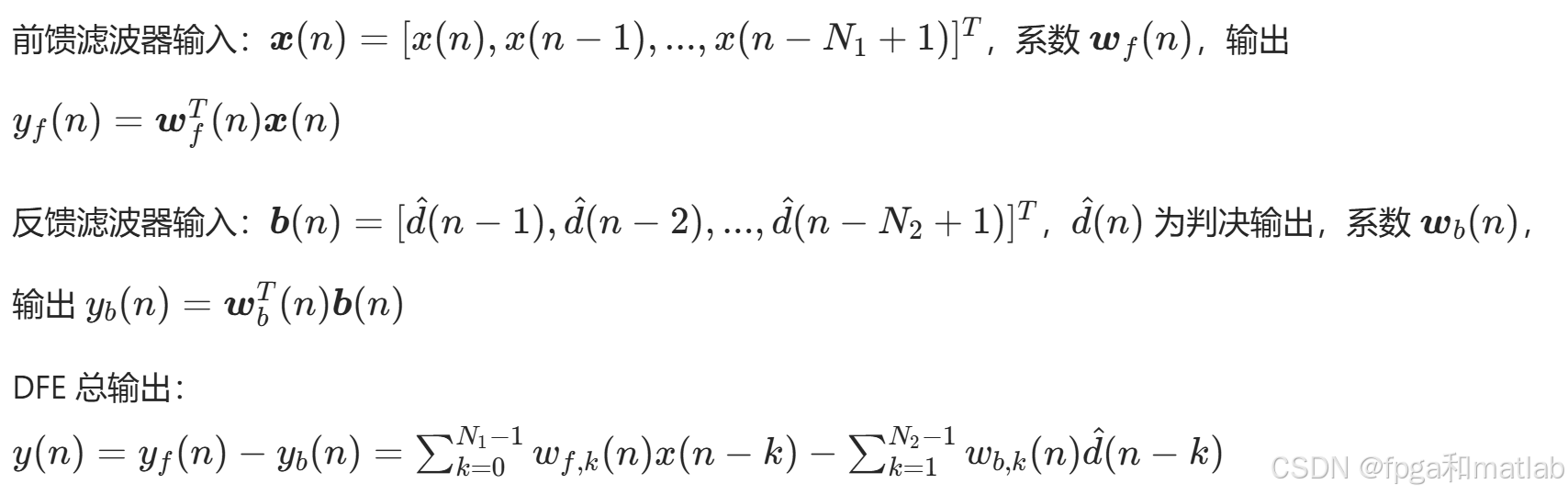 DFE由前馈滤波器和反馈滤波器组成,前馈滤波器处理当前接收信号,反馈滤波器处理已判决信号以消除后向ISI。