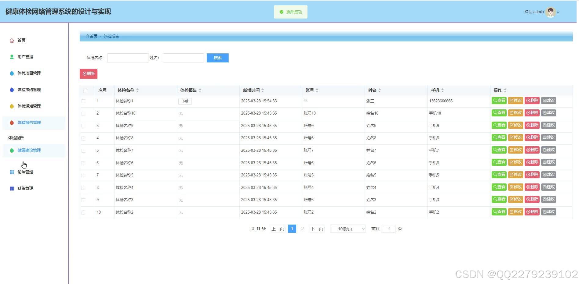 本文介绍了一个基于Java SpringBoot的健康体检网络管理系统,旨在解决传统体检预约渠道单一、排队耗时长、报告获取延迟等问题。系统采用SpringBoot后端框架、Vue前端框架和MyBatisPlus持久层框架,实现体检预约、报告管理、数据统计等功能。文章详细展示了系统技术架构、功能模块、测试流程及代码实现,包括登录验证、权限控制等核心代码片段。该系统通过数字化管理简化体检流程,提升用户