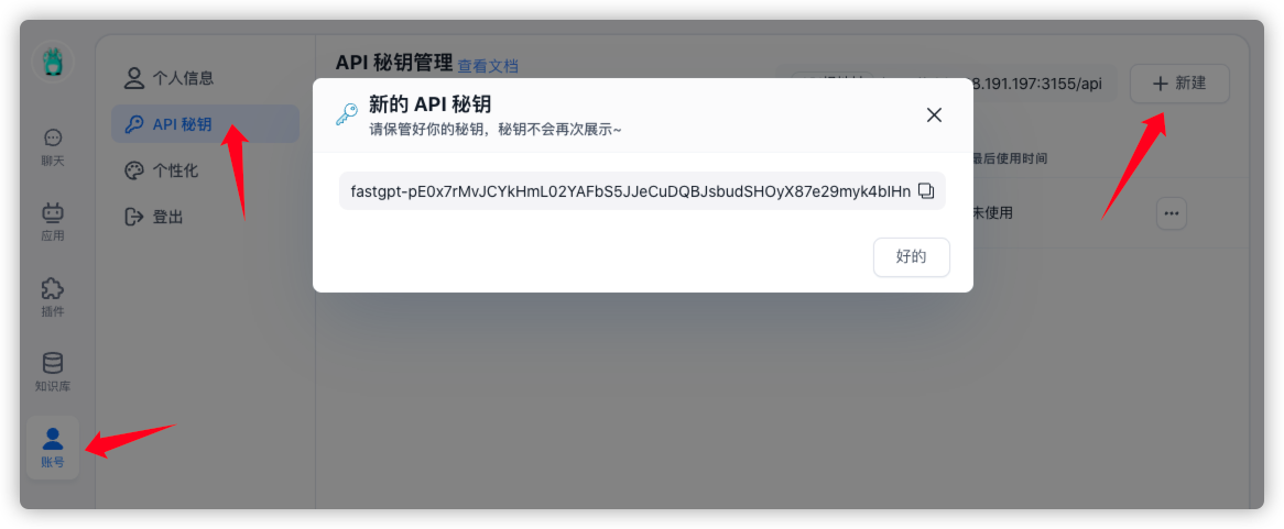 当然,你还可以将 FastGPT 通过 OpenAPI 接口,被第三方应用调用,可以是全局 API key(可操作 FastGPT 上的相关服务和资源,无法直接调用应用对话)