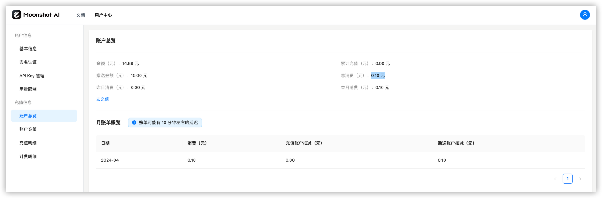 看看 Moonshot AI 赠送的 15块 还剩下多少?