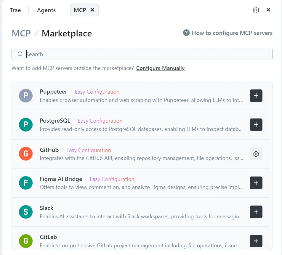 比如 Trae 里可以直接在内置的 MCP Marketplace 里浏览现成的 MCP Server: