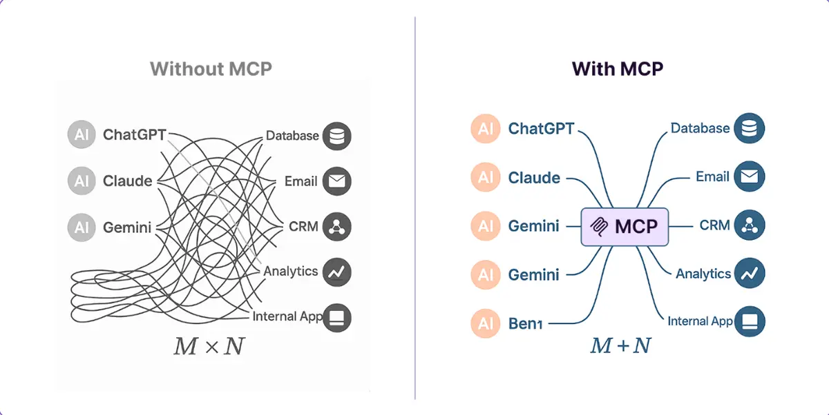 运维负担:在企业级应用中每增加一个大语言模型或新增一个业务系统,都要修改若干段「点对点连接」代码,最终导致系统级测试矩阵呈指数级膨胀。