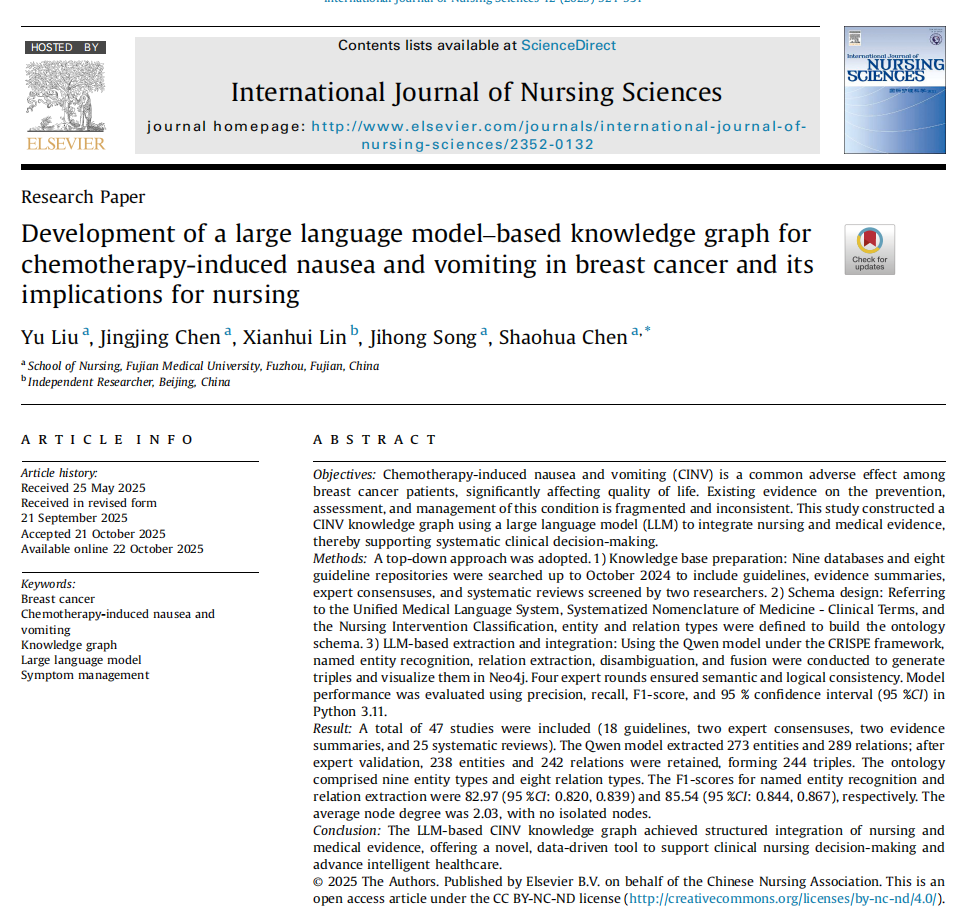 本研究利用大语言模型构建乳腺癌化疗所致恶心呕吐(CINV)知识图谱,整合护理与医学证据,为临床决策提供系统化支持。通过Qwen模型提取238个实体和242个关系,F1分数超过82%,为精准护理管理提供数据驱动的智能工具。