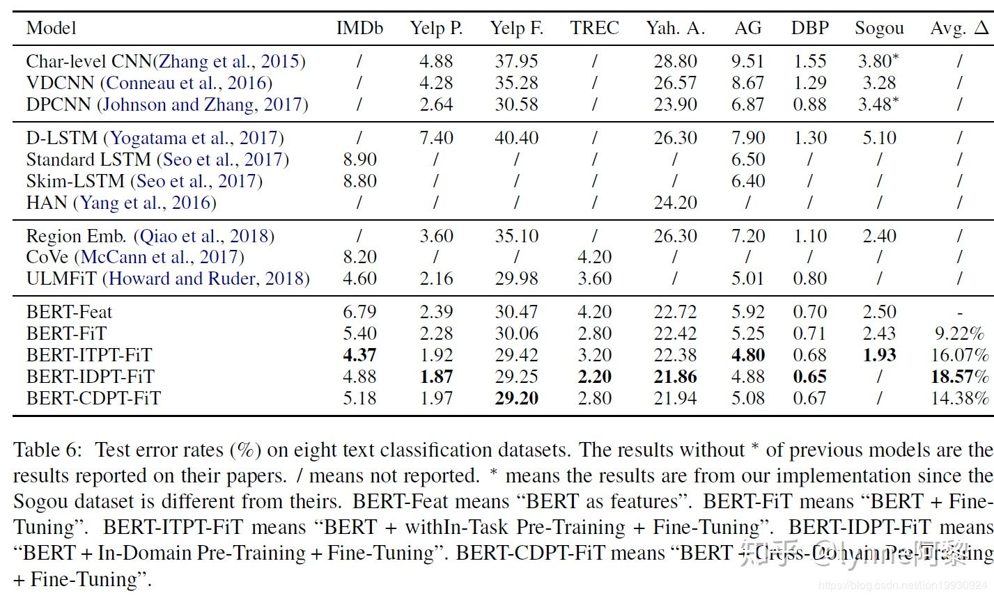 本文使用了IMDB, Yelp评论数据集用于做情感分析,TREC(公开领域的问答数据集),yahoo问答用于问题分类,AG新闻,DBPedia和Sougou新闻做主题分类。文中使用WordPiece embeddings以##切分句子。对Sougou新闻采用"。", "?", "!"来分隔句子。