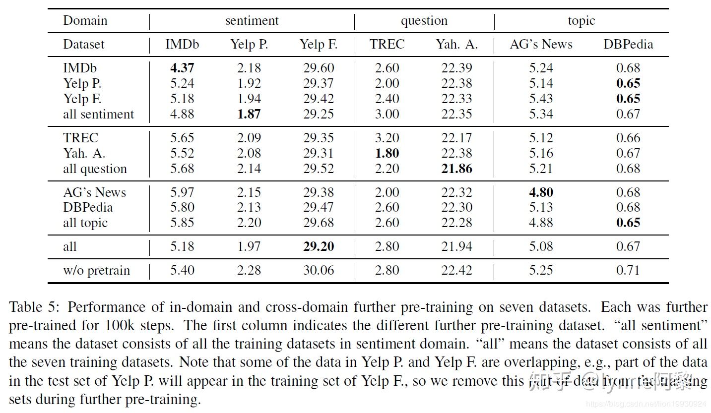 文中将语料分为情感分析,问题分类和主题分类三个领域,在这些语料上按照领域内和跨领域的预训练。下图是预训练的结果,all是使用了所有领域内的语料进行了预训练,w/o是原始的bert。可以看到不管是领域内还是跨领域经过预训练的效果都比原始的Bert有所提高。不过需要注意,小规模语料的TREC经过领域内训练的效果变差了。