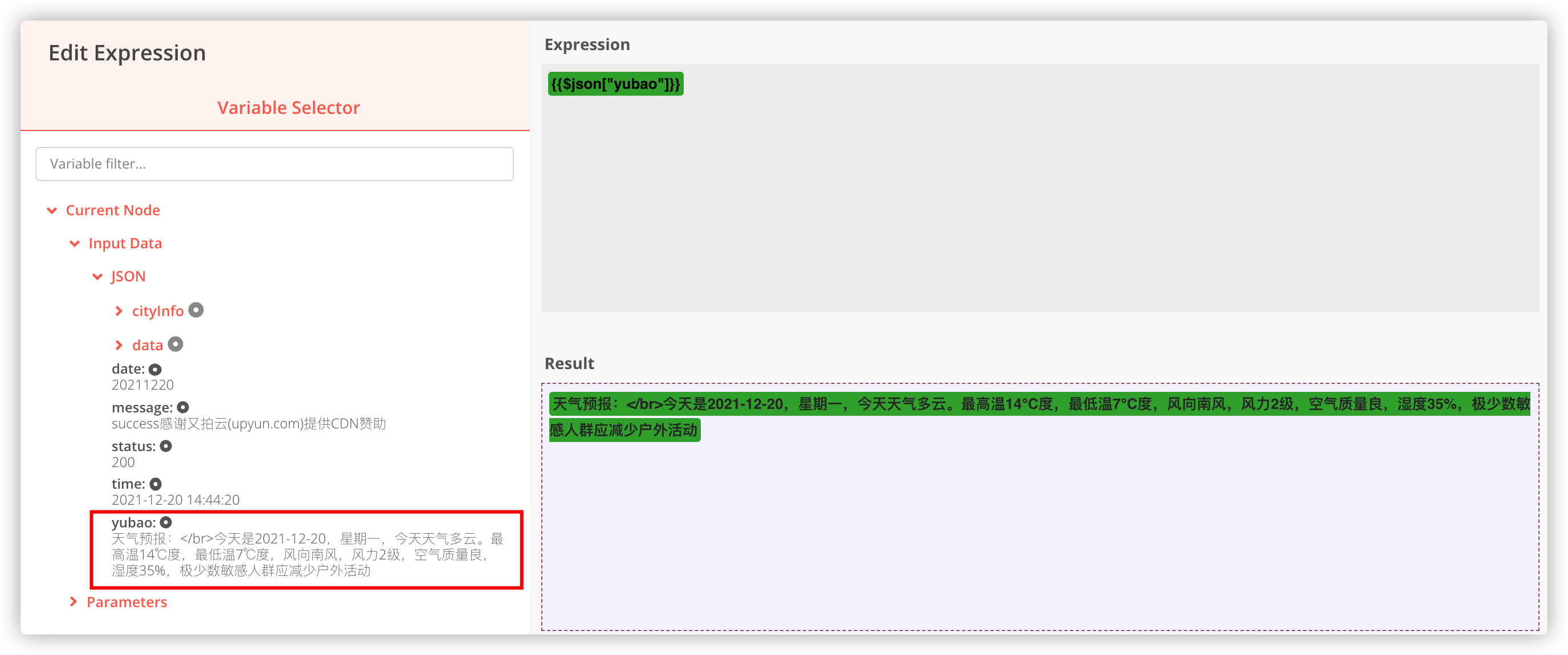 逐级展开 Current Node --> Input Data --> JSON --> data --> yubao