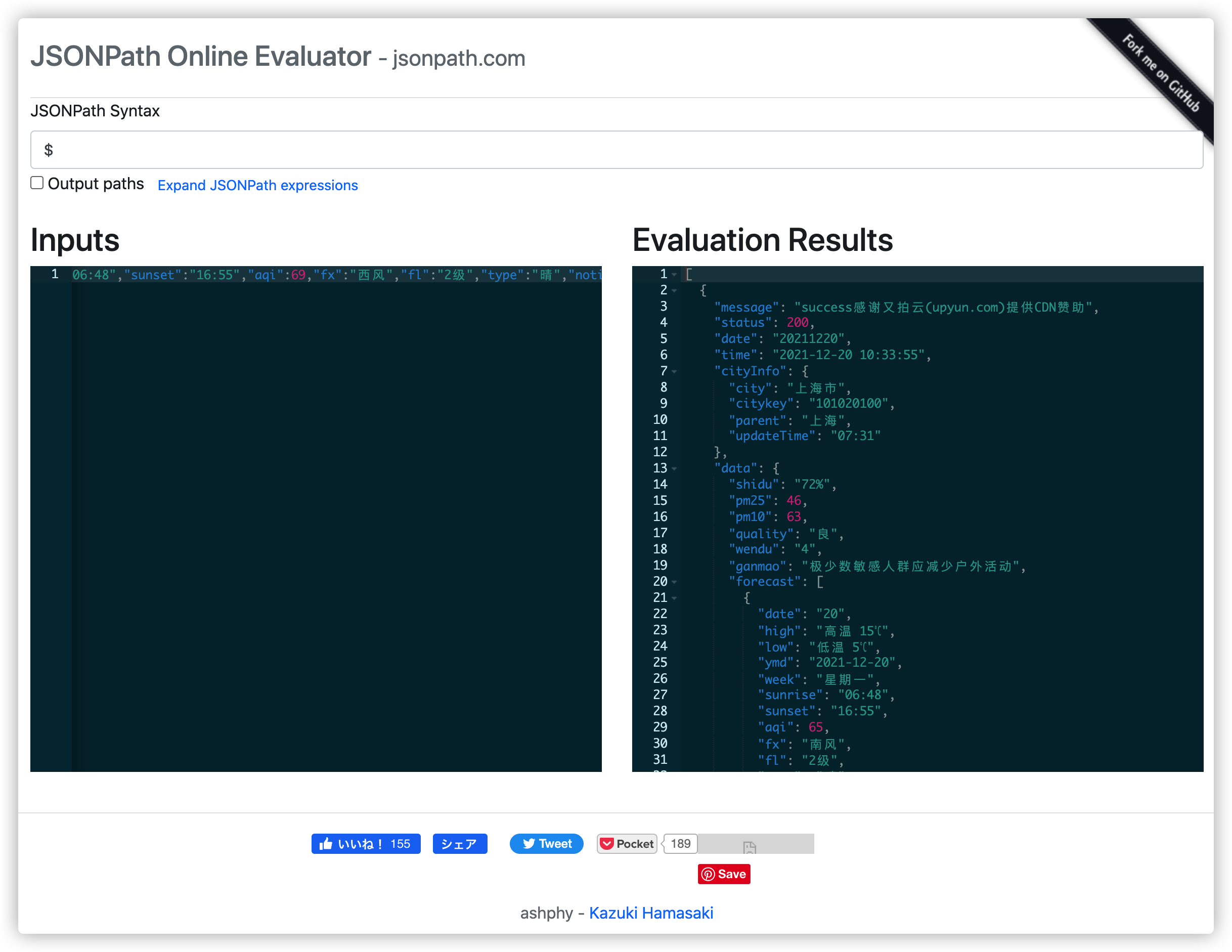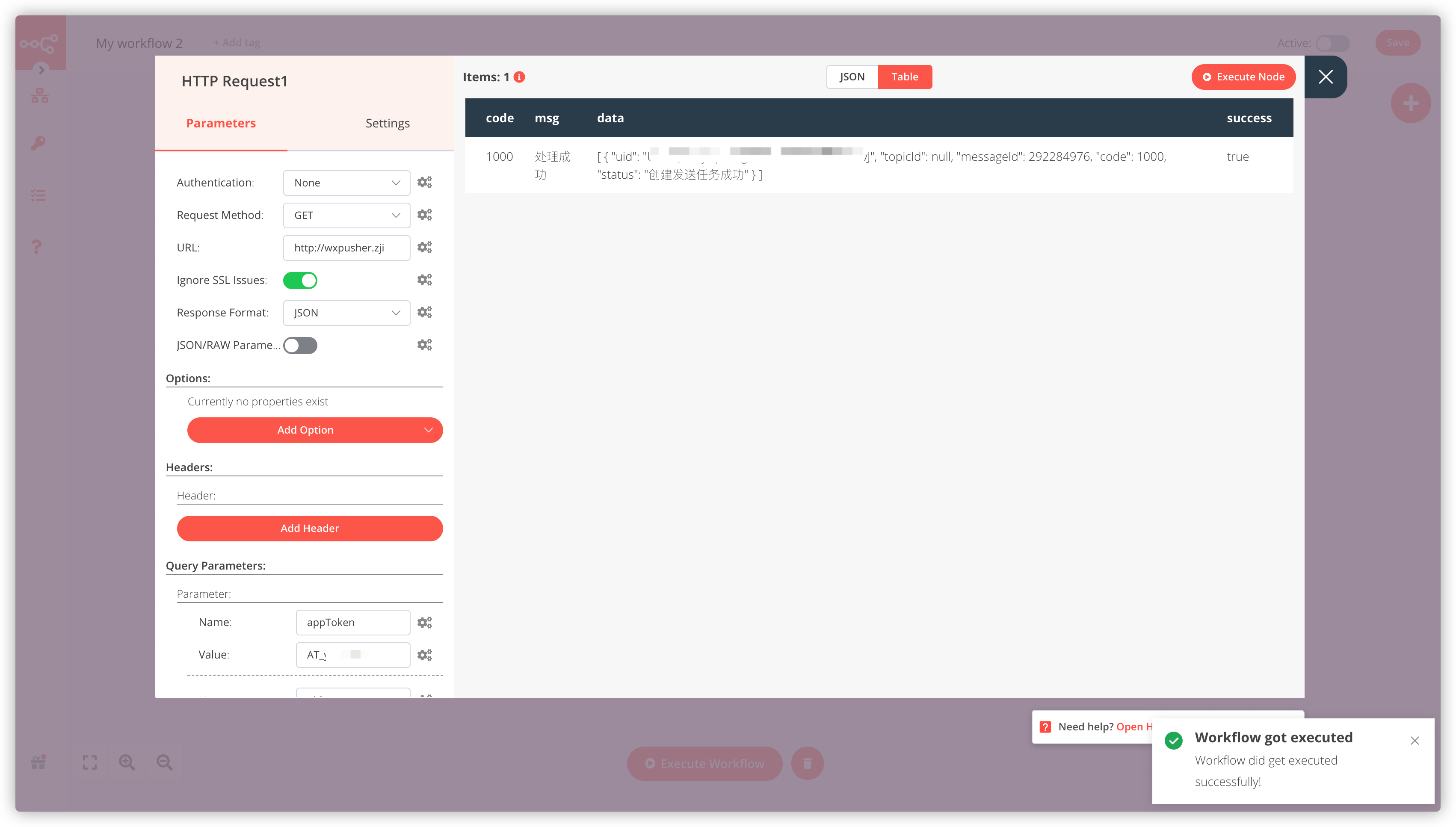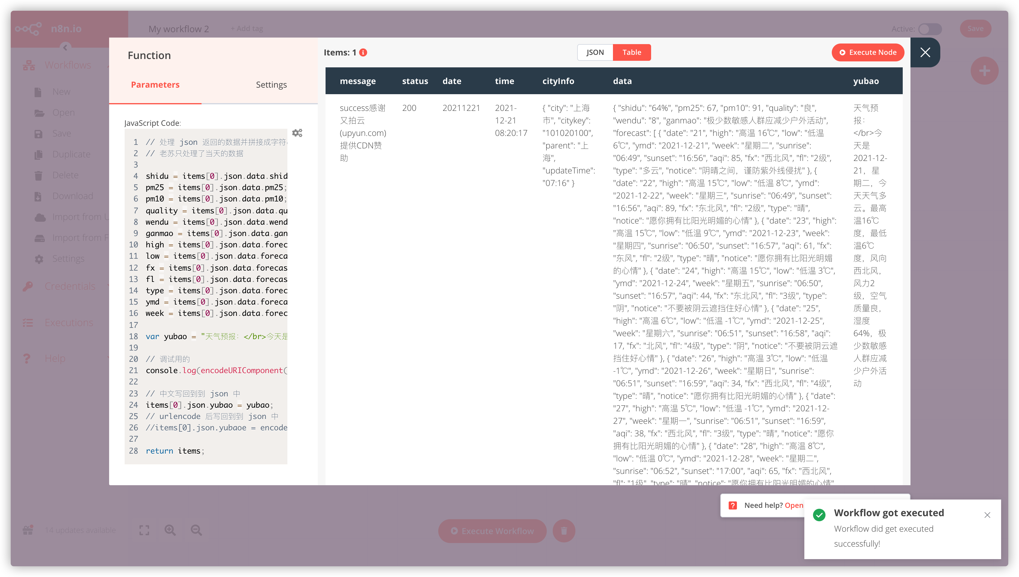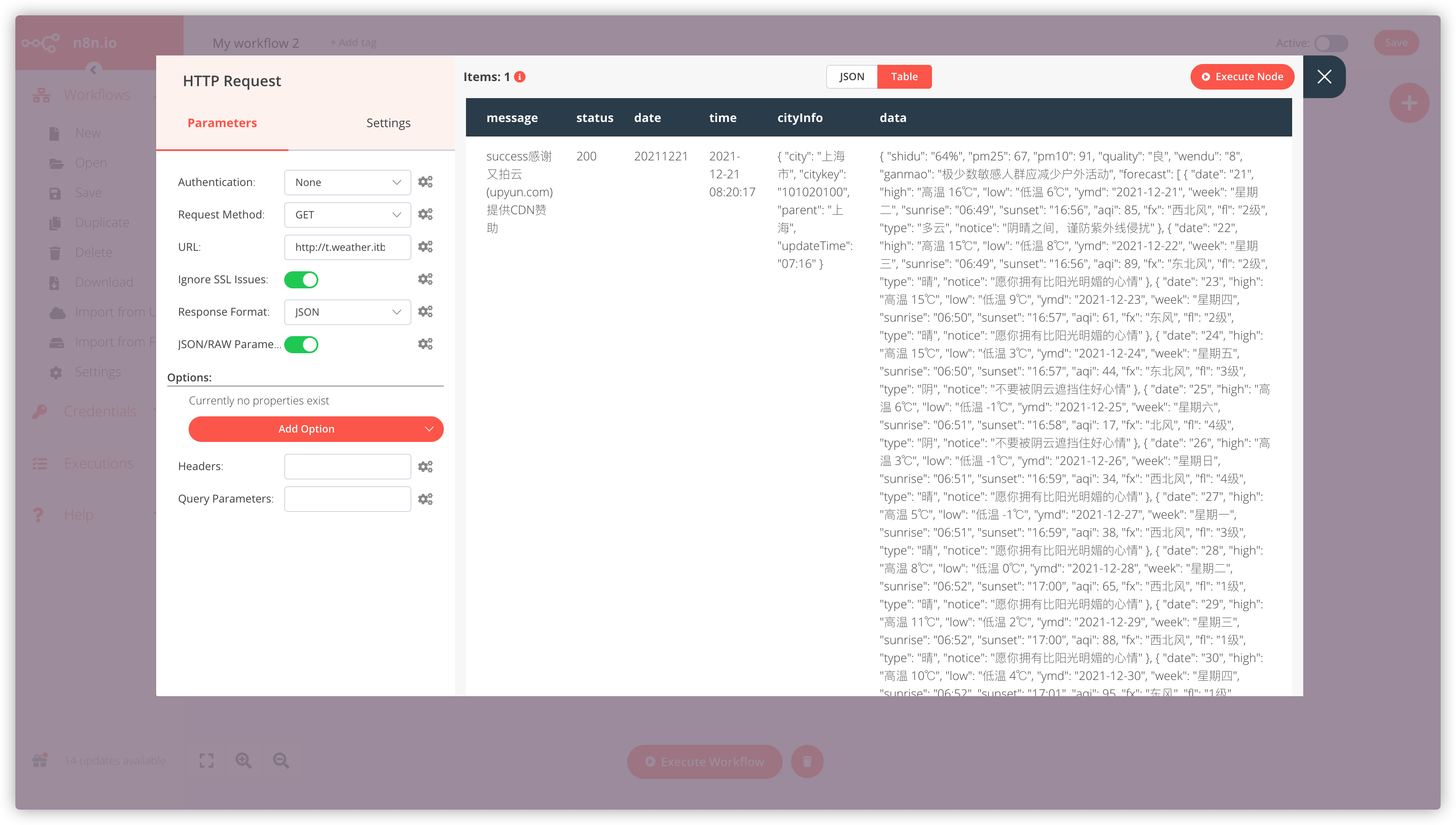 填完之后点右上角的 Execute Node,不出状况的话会返回相应城市的天气信息