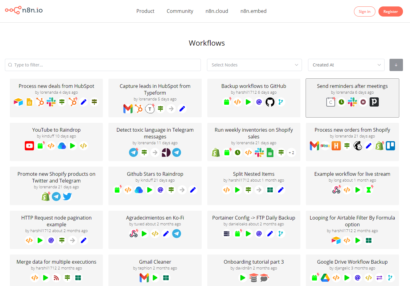 在官网我们能找到大量的工作流:https://n8n.io/workflows,找到适合的可以导入我们的系统中,不过说实话,国外的应用很多我们都用不了。