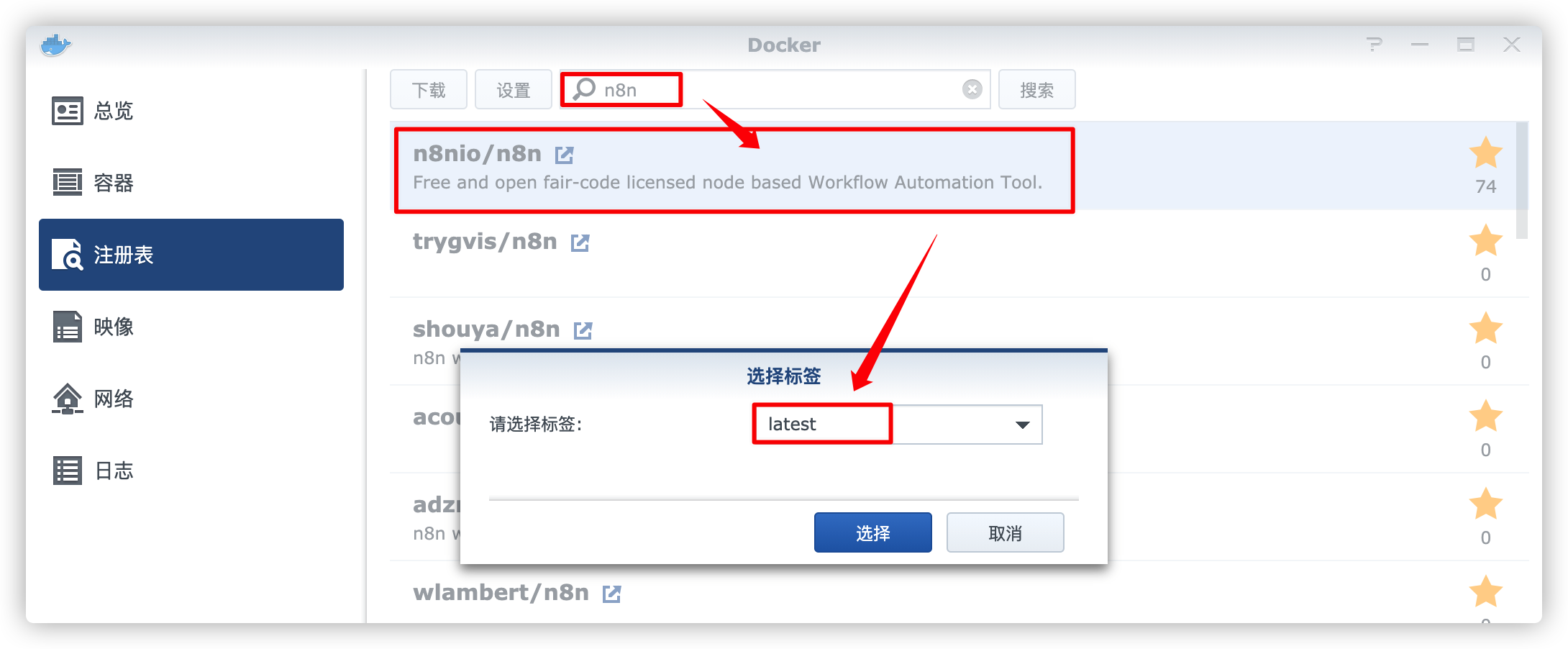 在注册表中搜索 n8n ,选择第一个 n8nio/n8n,版本选择 latest。