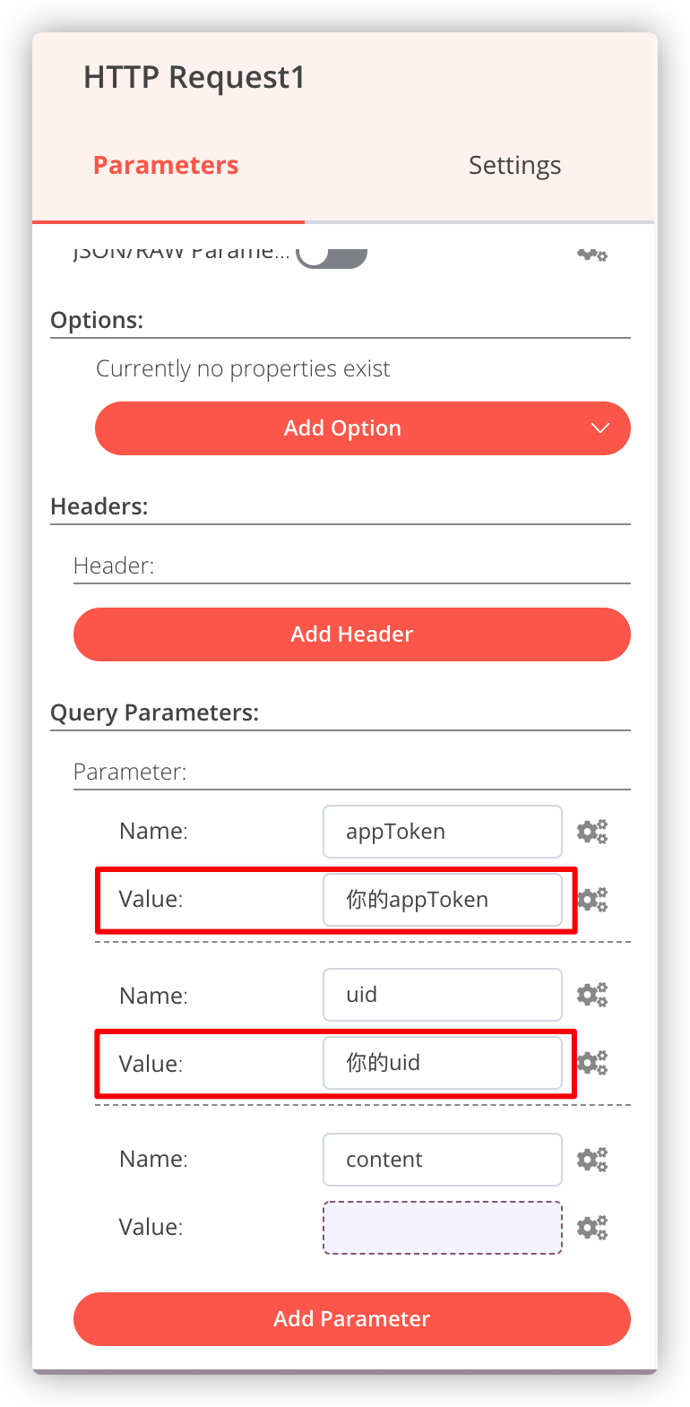 除此之外还需要在 Query Parameters 中通过 Add Parameter 增加 3 个参数