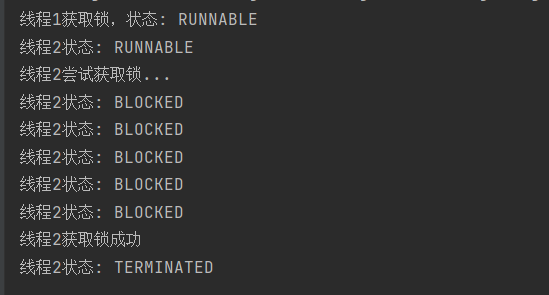 System.out.println("线程1获取锁,状态: " + Thread.currentThread().getState());