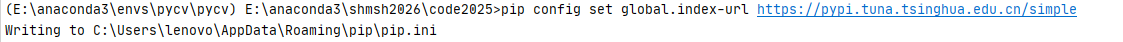 执行以下命令永久配置清华镜像源,使用pip config set global.index-url https://pypi.tuna.tsinghua.edu.cn/simple命令。运行结果是自动出现 Writing to C:\Users\lenovo\AppData\Roaming\pip\pip.ini表示是写入到pip.ini了。此操作会修改pip的全局配置文件,后续所有包安装均通过该