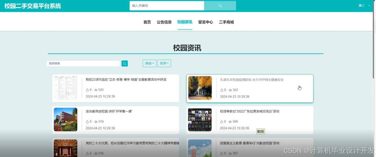 在系统的首页点击菜单栏中校园资讯这个按钮,查看校园资讯列表,对校园资讯进行查询 |