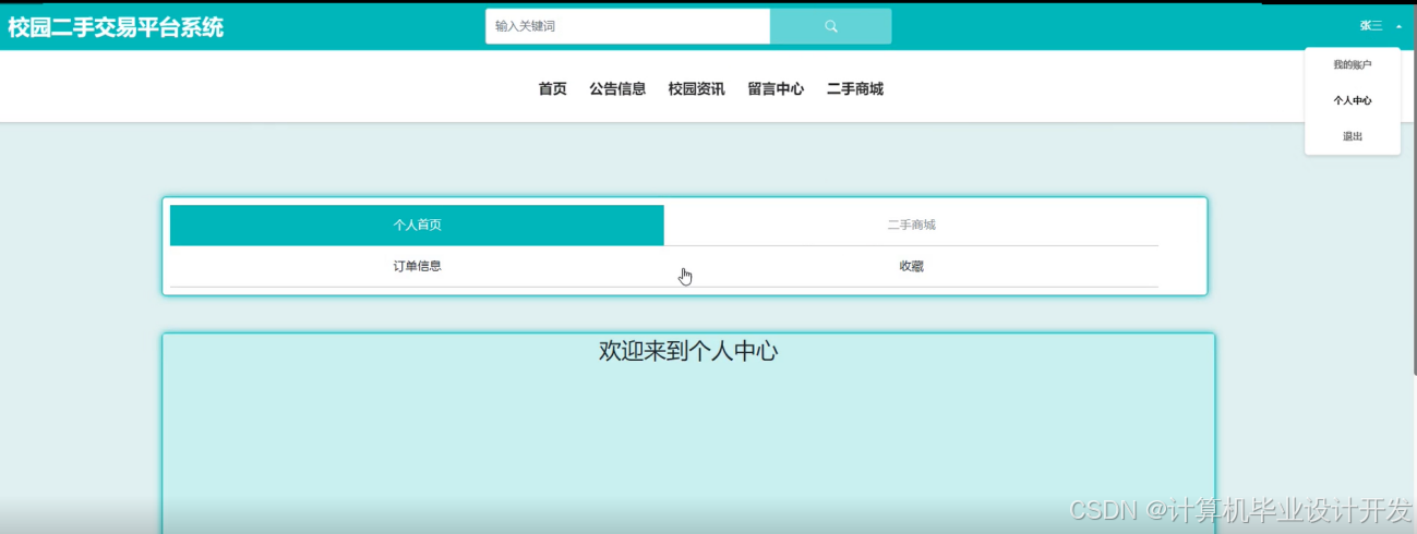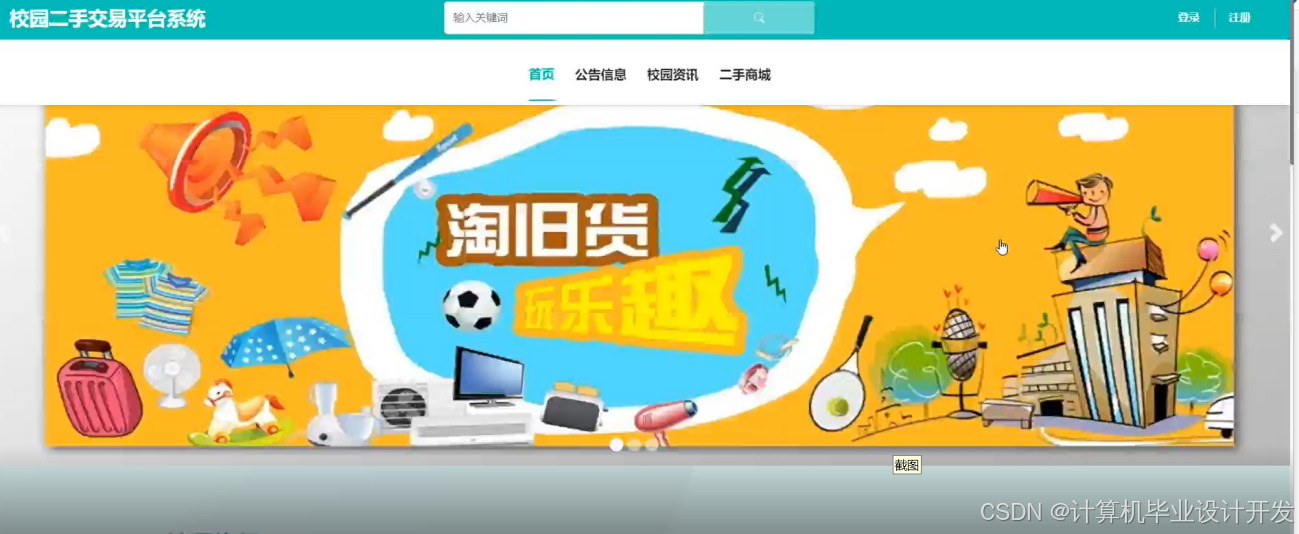 当进入二手交易平台系统的时候,首先映入眼帘的是系统的导航栏、轮播图以及公告信息,在左上角能够看到导航栏,其主界面展示如下图4.1所示。