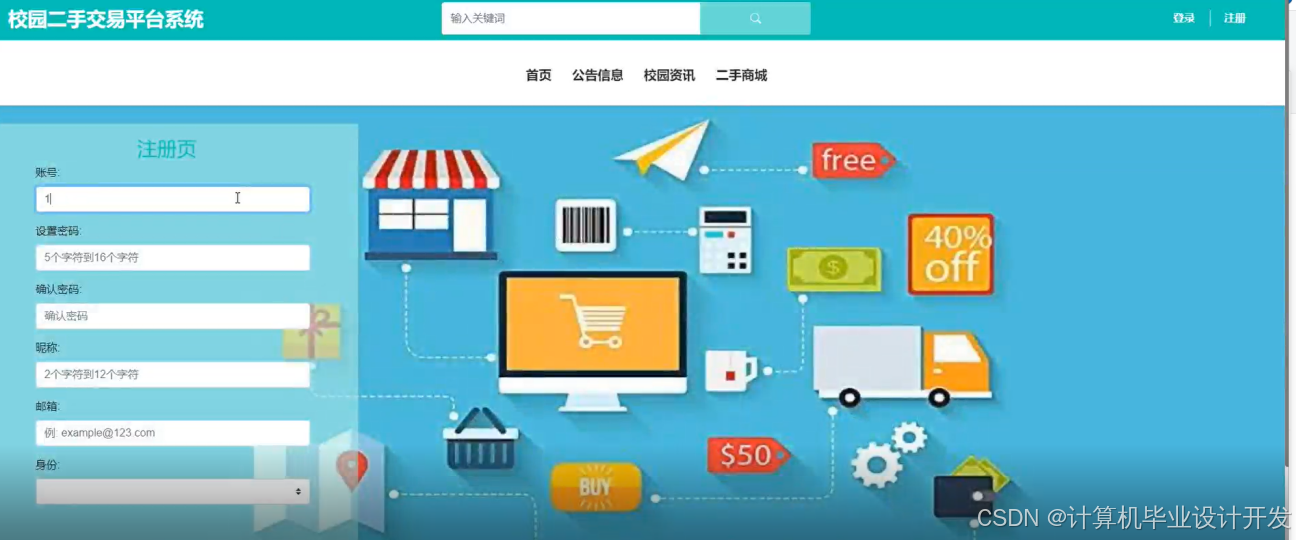 不是二手交易平台系统中用户的是可以在线进行注册的,当用户点击右上角“注册”按钮的时候,当填写上自己的账号+密码+确认密码+昵称+邮箱+手机号后等信息再点击“注册”按钮后将会先验证输入的有没有空数据,再次验证密码和确认密码是否是一样的,最后验证输入的账户名和数据库表中已经注册的账户名是否重复,只有都验证没问题后即可用户注册成功。其用用户注册界面展示如下图4.2所示。