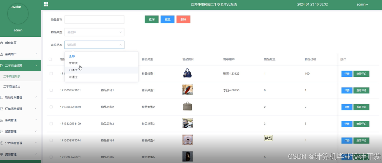 二手商城管理:管理二手商品的发布、编辑、删除等操作,支持商品信息审核和管理。,界面如下图4.11所示。