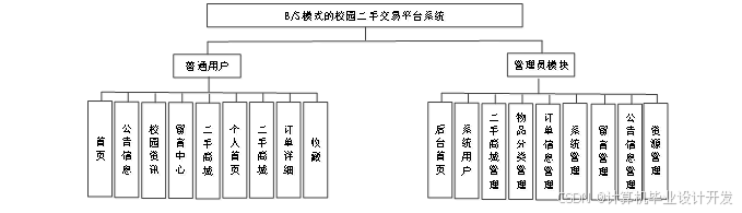 系统的整体架构确定以后,再来看二手交易平台系统的主要功能模块图。整体的功能模块包括管理员+用户两个模块,实现的模块主要有用户管理、二手商城管理,物品分类管理,订单信息管理,系统管理,留言管理,公告信息管理等。