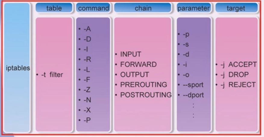 iptables [-t 表明] 管理选项 [链名] [匹配条件] [-j 控制类型]