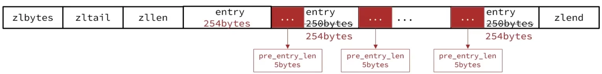 当在前面插入一个新的数据时,会导致后面每一个数据空间也需要改变,就可能造成了连锁更新。连锁更新会导致ziplist的内存空间需要多次重新分配,直接影响ziplist的查询性能。(由于前一节点长度增加,后一个节点要保存前一个节点的长度,也会增加,再后一个保存前面的大小随着都需要增加。。。)
