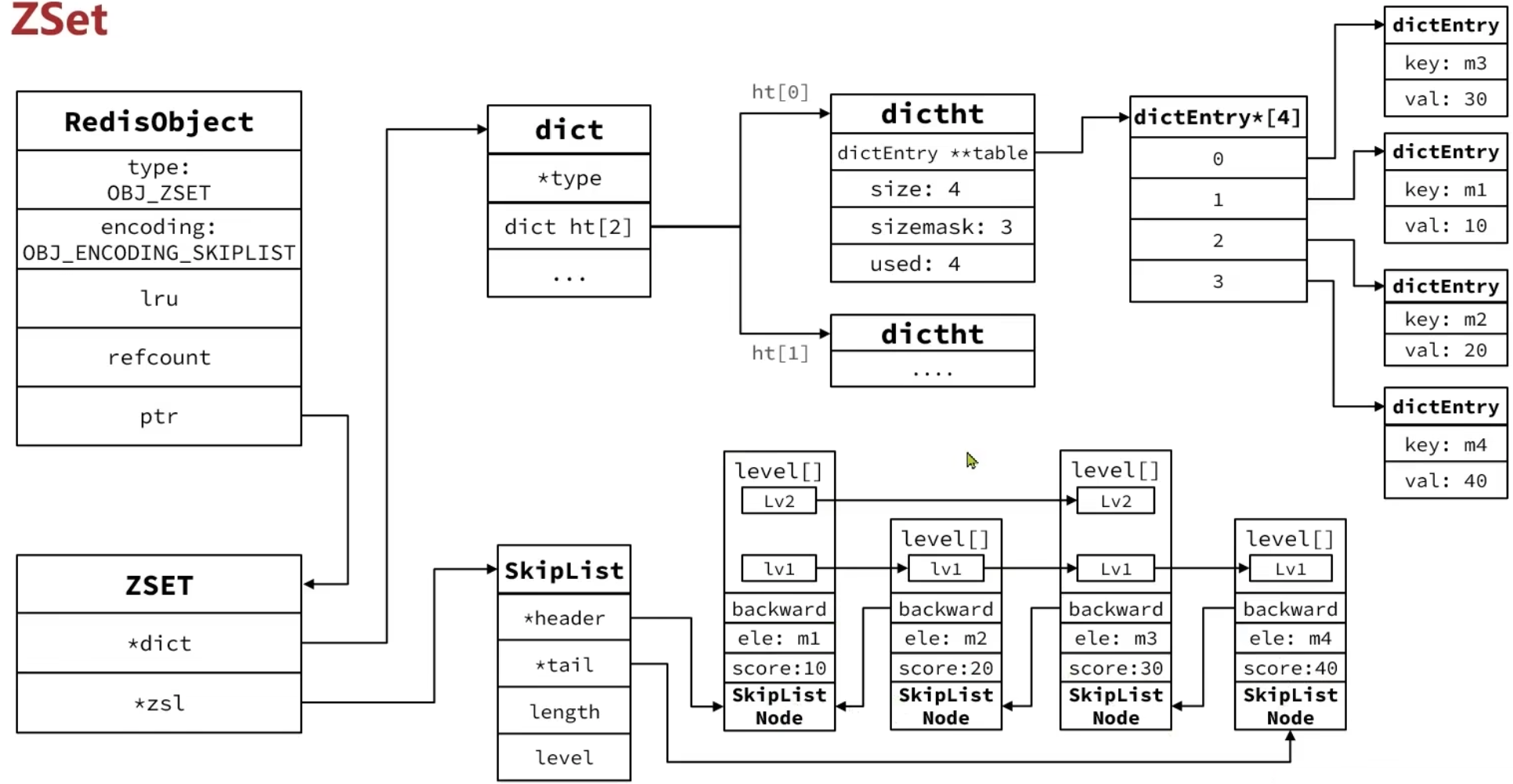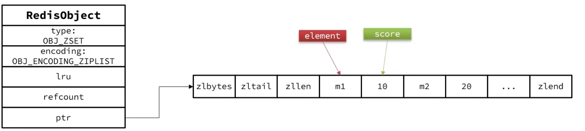 ZipList是连续内存,因此score和element是紧凑在一起的两个entry,element在前,score在后