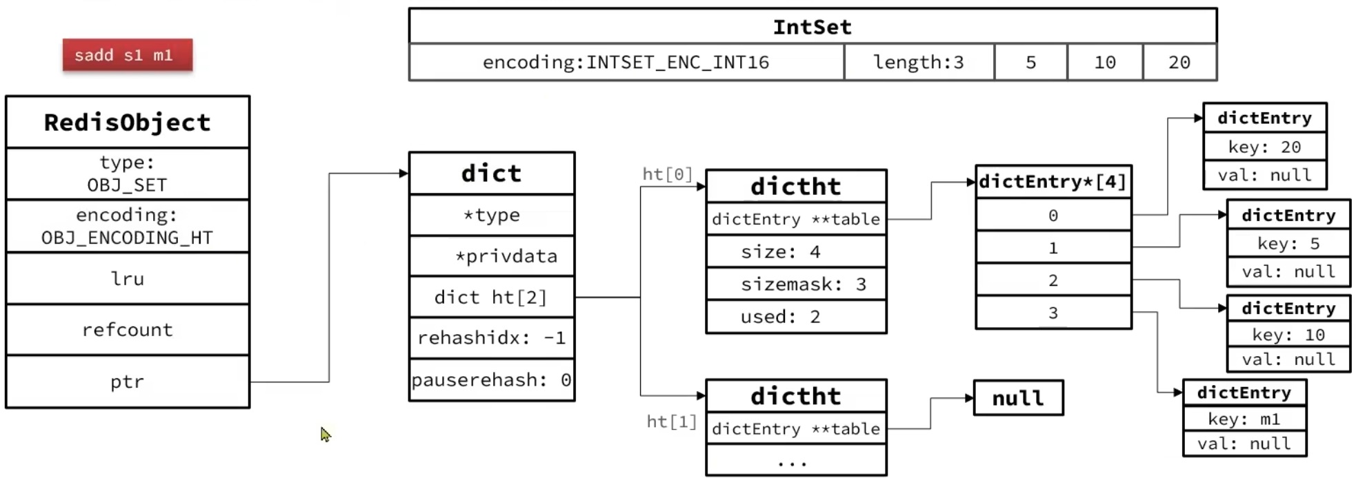 为了查询效率和唯一性,set采用HT编码(Dict),dict中的key用来存储元素,value统一为null。