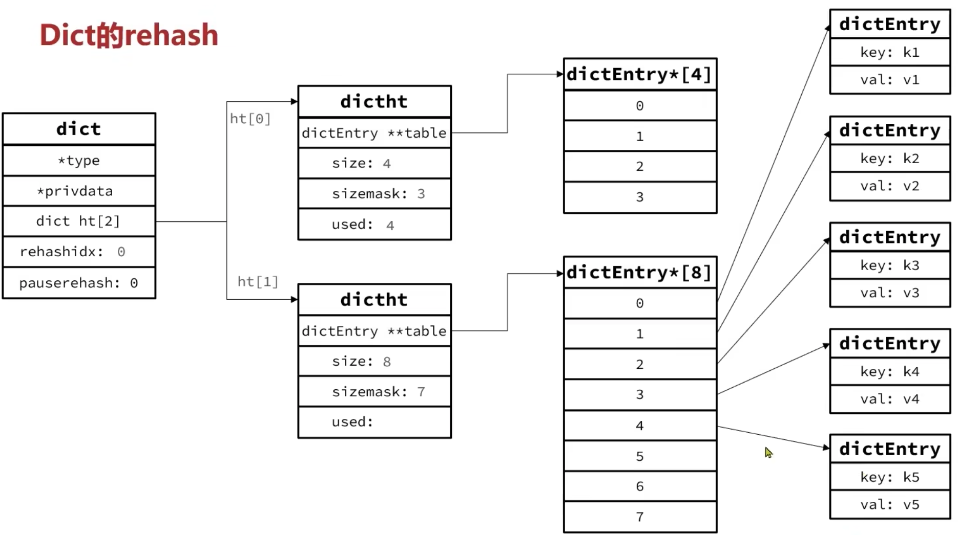 (5)将dict.ht[1]赋值给dict.ht[0],给dict.ht[1]初始化为空哈希表,释放原来的dict.ht[0]的内存。