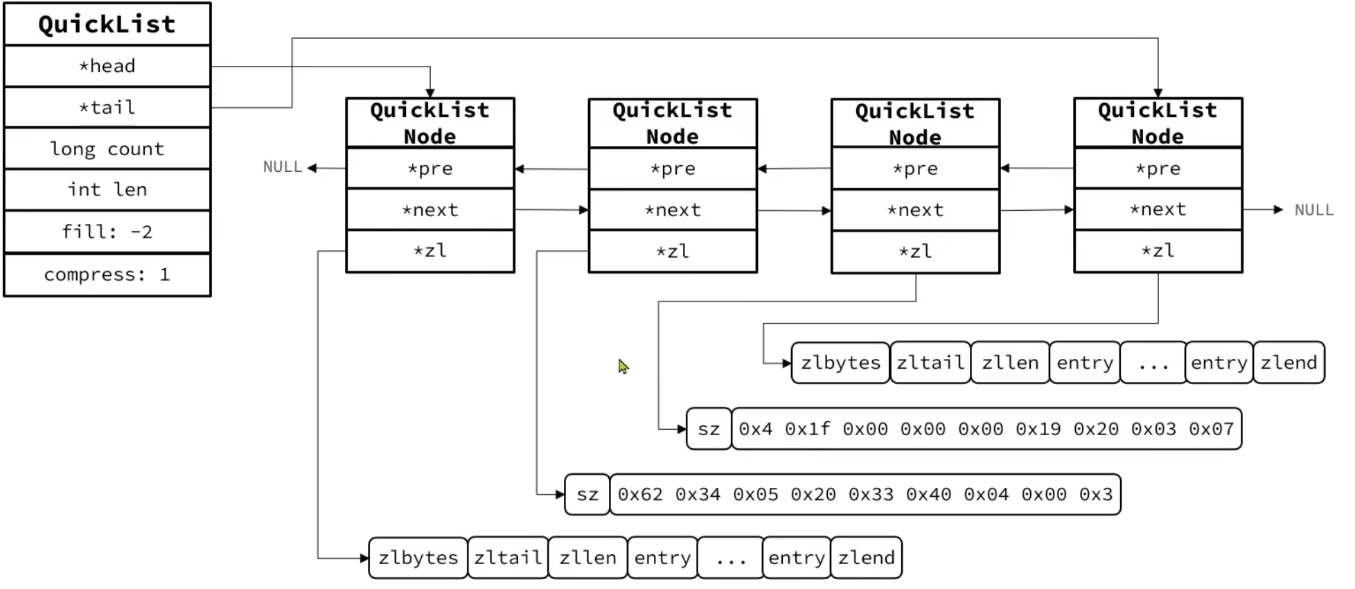 QuickList:LinkedList+ZipList,可以双端访问,内存占用较低,包含多个ZipList,存储上限高。