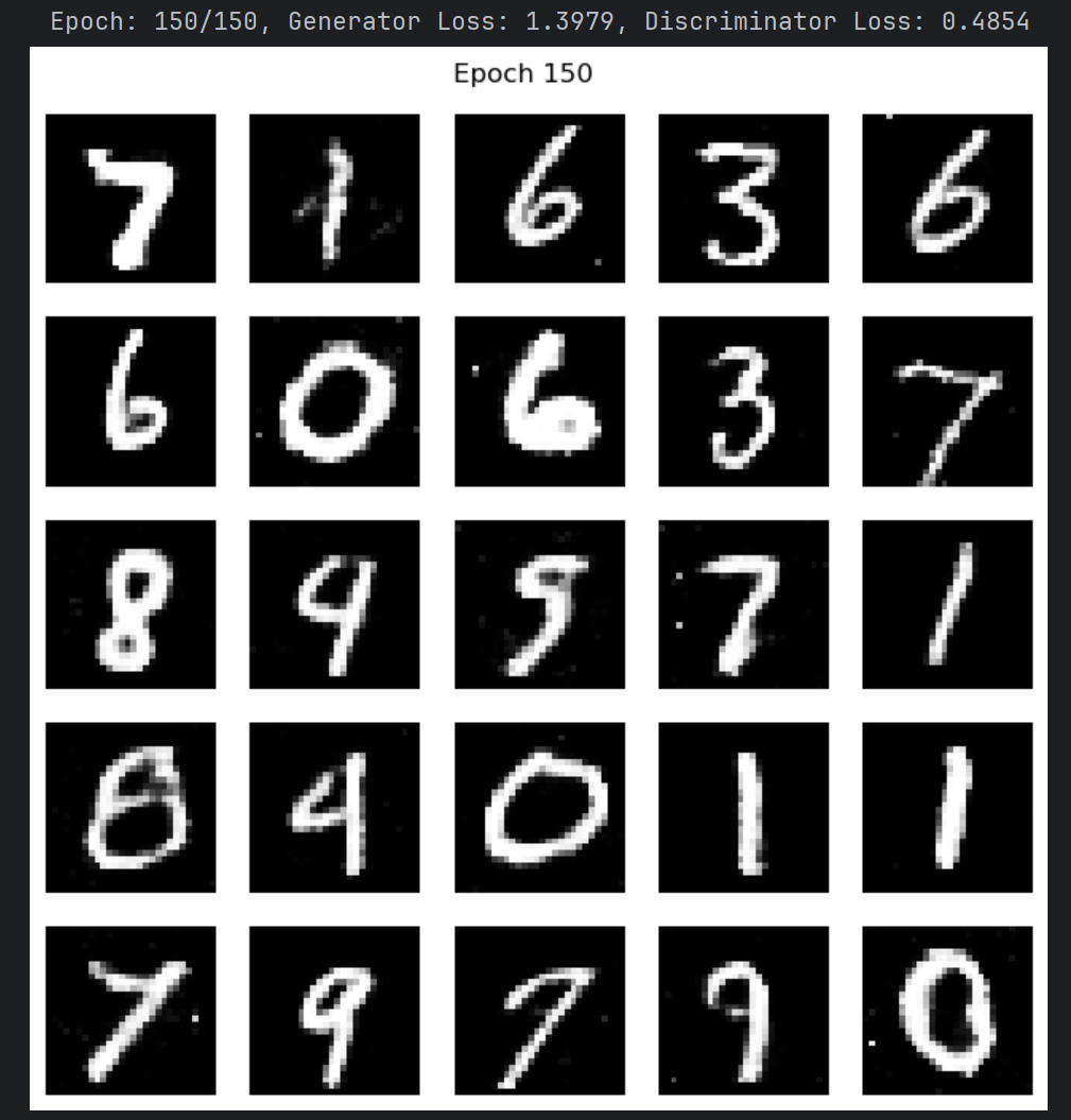 print(f"Epoch: {epoch+1}/{n_epochs}, Generator Loss: {generator_loss_acc / len(train_loader):.4f}, Discriminator Loss: {discriminator_loss_acc / len(train_loader):.4f}")