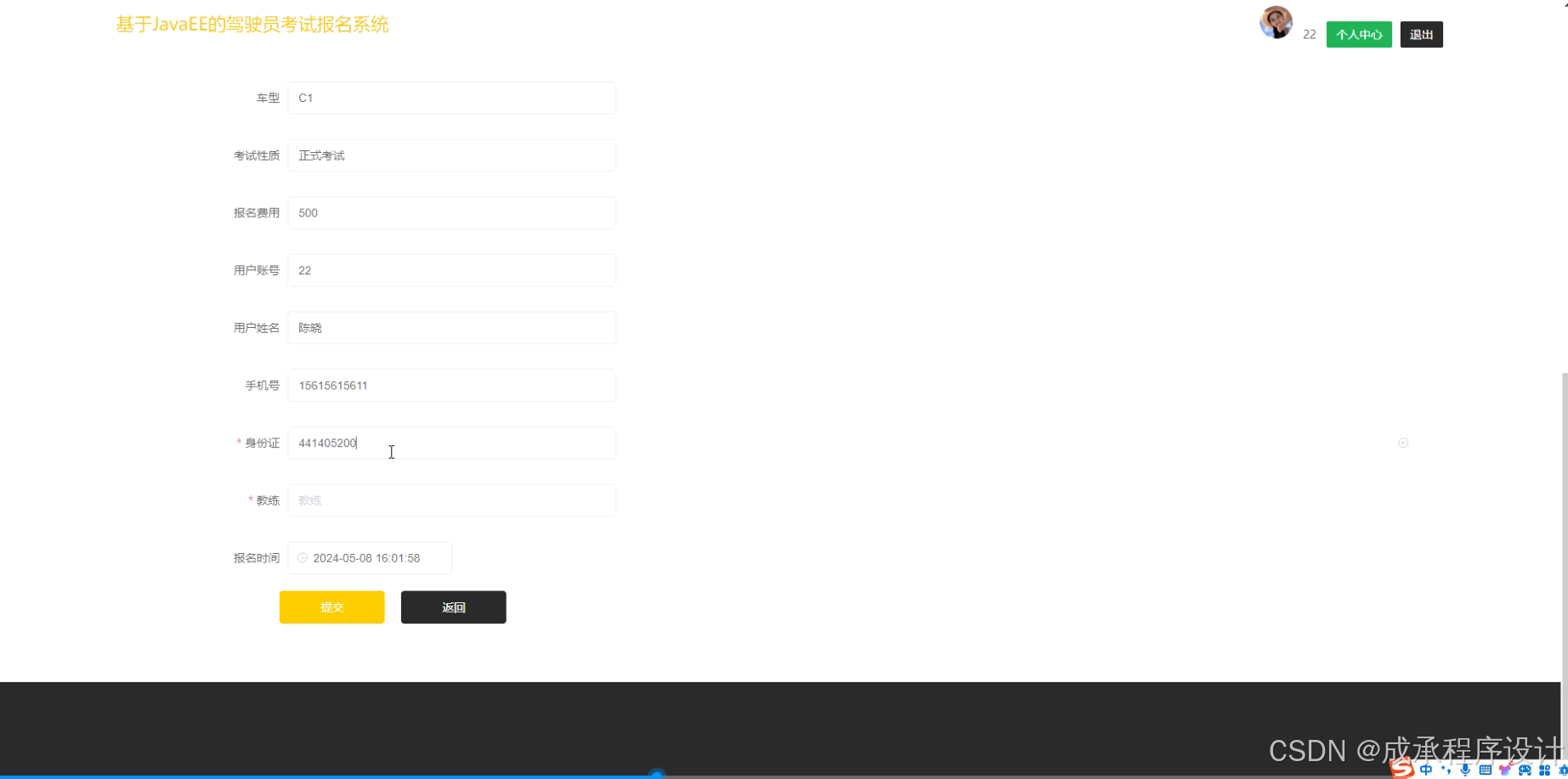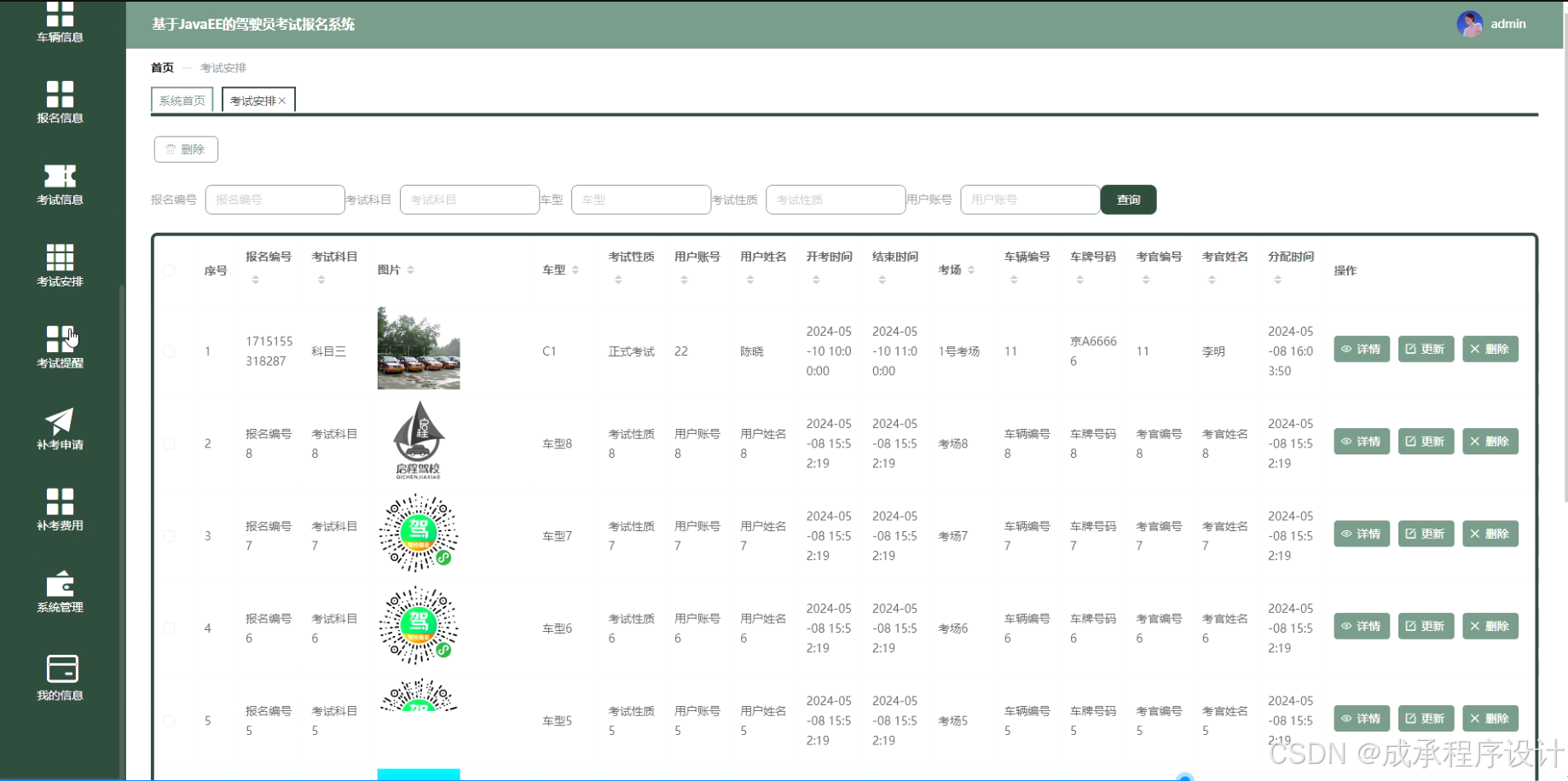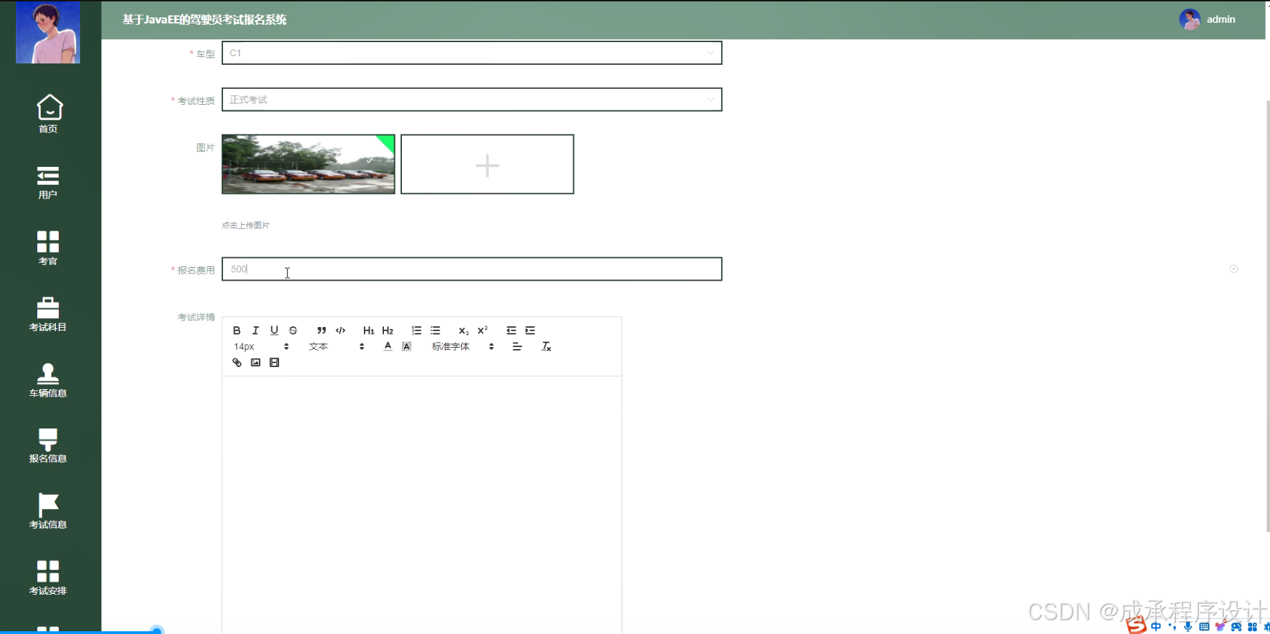- 构建一个完整的驾驶员考试报名系统:系统具备用户、考试科目、教练、报名信息、考试信息、考试提醒、车辆信息、考试安排、补考费用、补考申请等功能模块,能够满足驾驶员考试报名管理的各项需求。