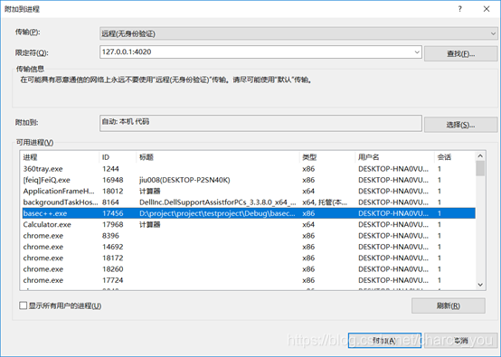 然后选择需要调试的exe点附加,开始进行调试。
