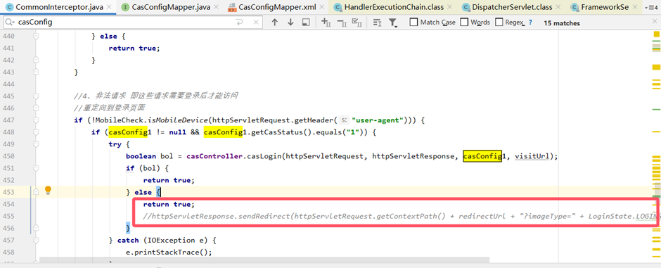 在src/com/xoa/global/intercptor下进入CommonInterceptor.java文件,在前置preHandle方法,注释重定向代码,改为:return true;