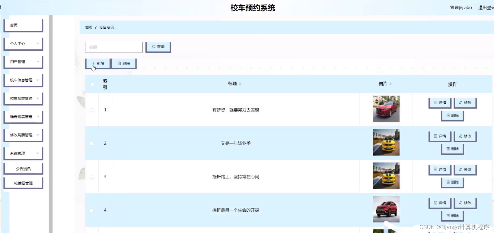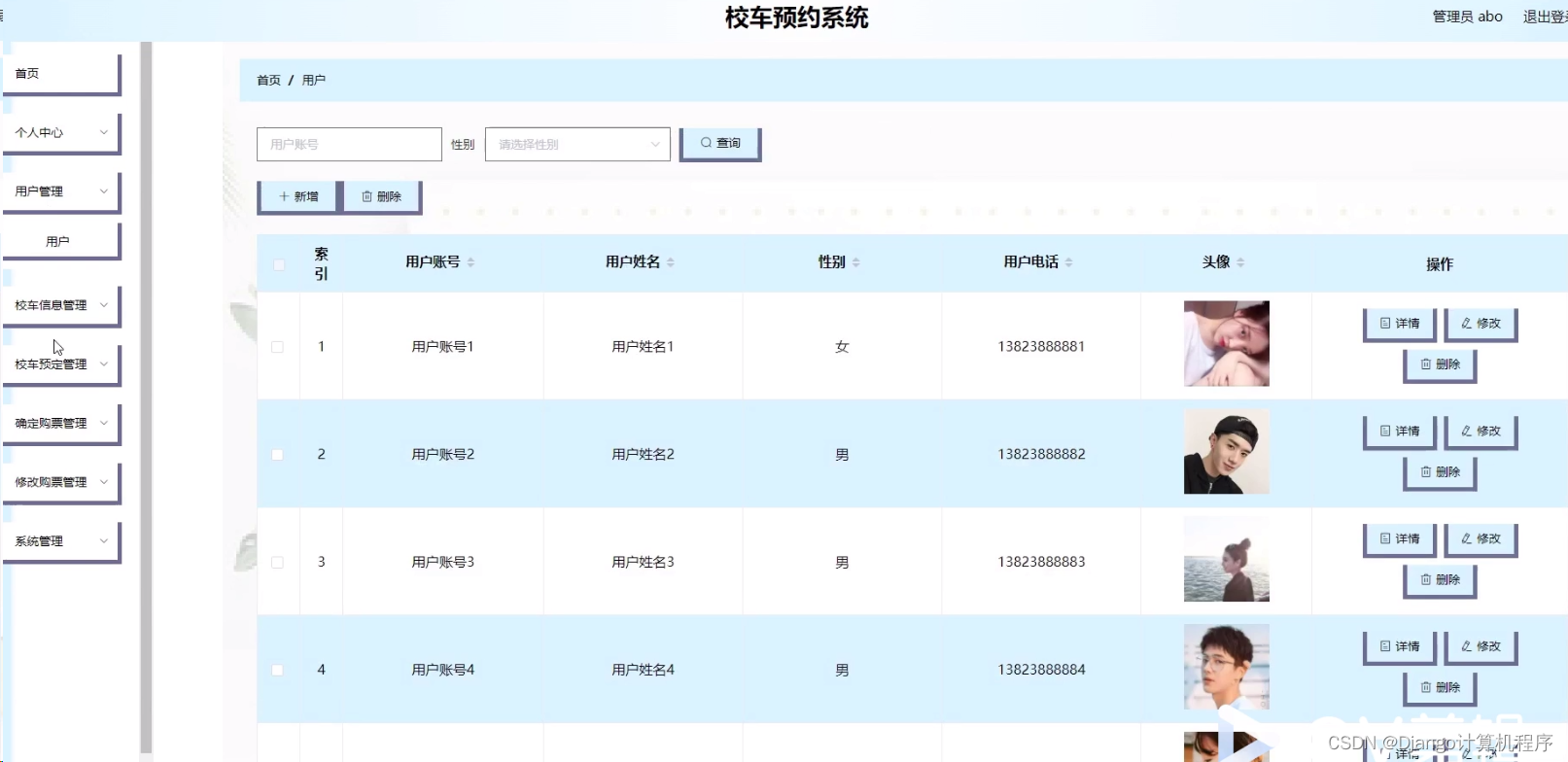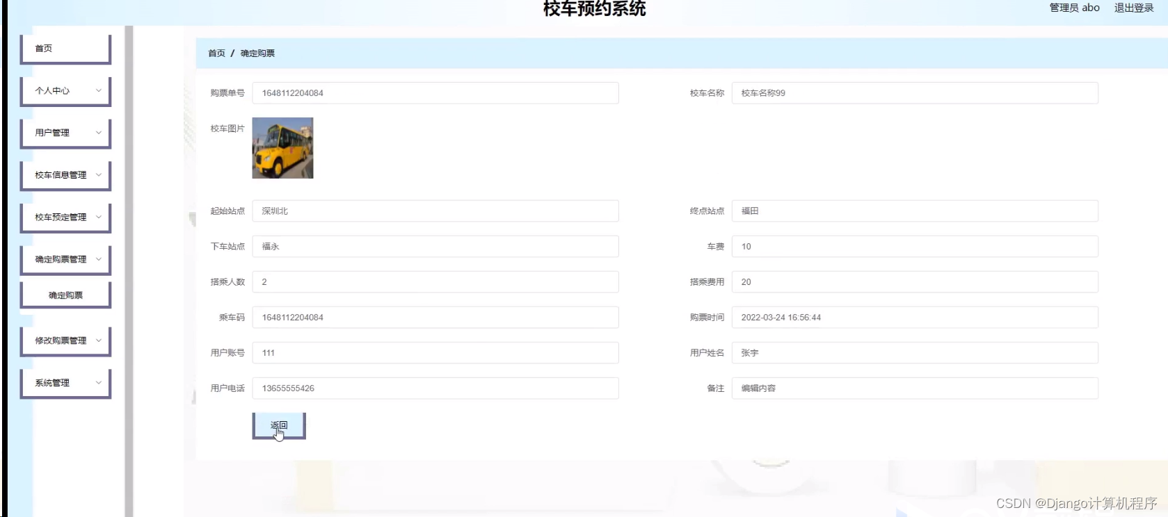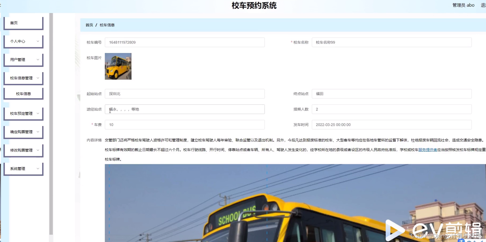 本系统采用前端技术HTML+CSS+JavaScript+Vue,后端技术Java+SSM,数据库MySQL5.7,开发工具Eclipse或IDEA,Tomcat7.0,JDK1.8,Maven3.3.9,旨在为学校提供一个高效、便捷、可靠的校车预约解决方案。方便家长和学生:家长可以通过系统实时了解校车的位置、预约校车座位,避免了传统电话预约或现场排队的不便,为家长和学生提供了便捷的服务。提高安全